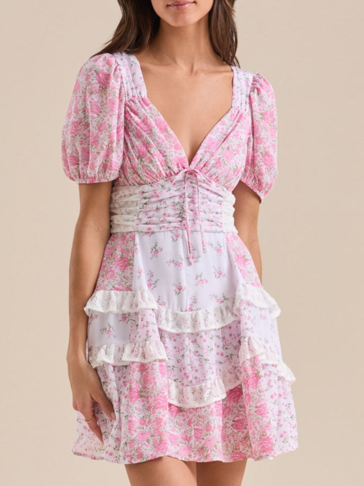 Smocked Sleeve Tiered V-Neck Mini Dress