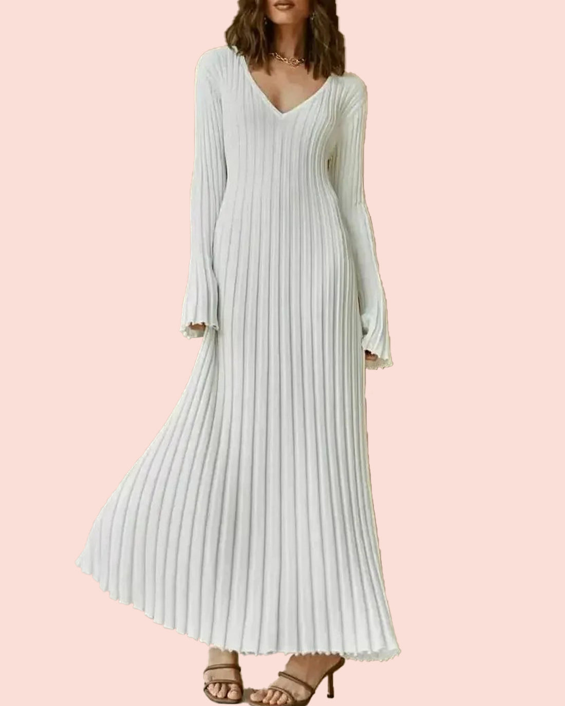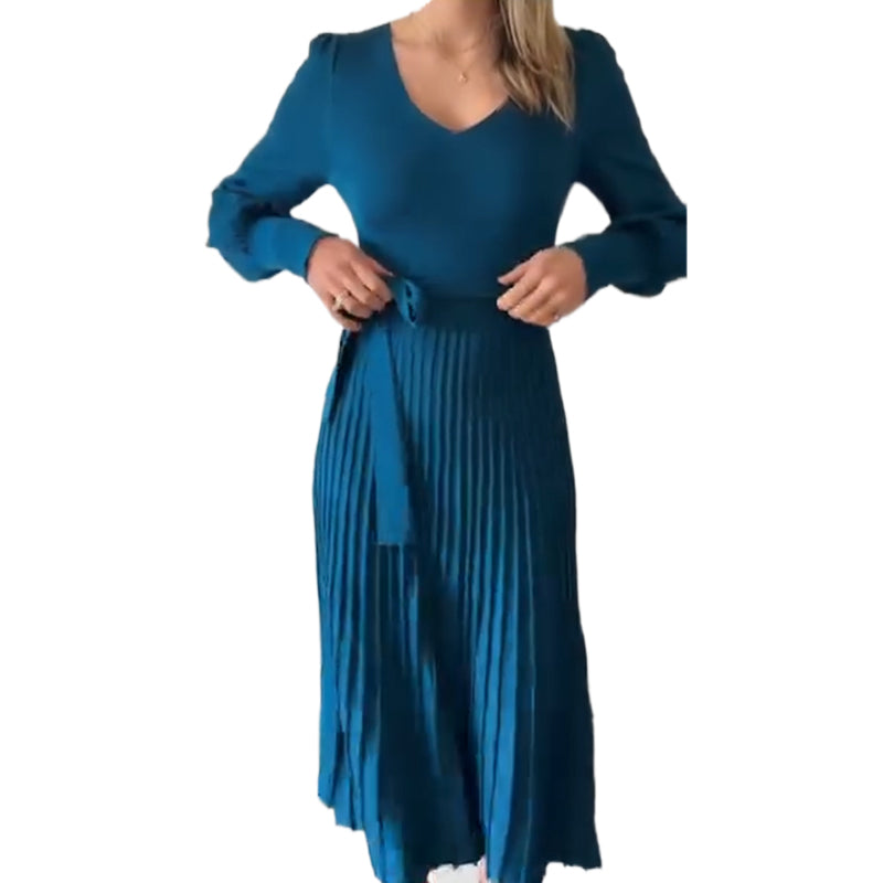 Women's Pleated V-Neck Midi Dress with Tie Waist