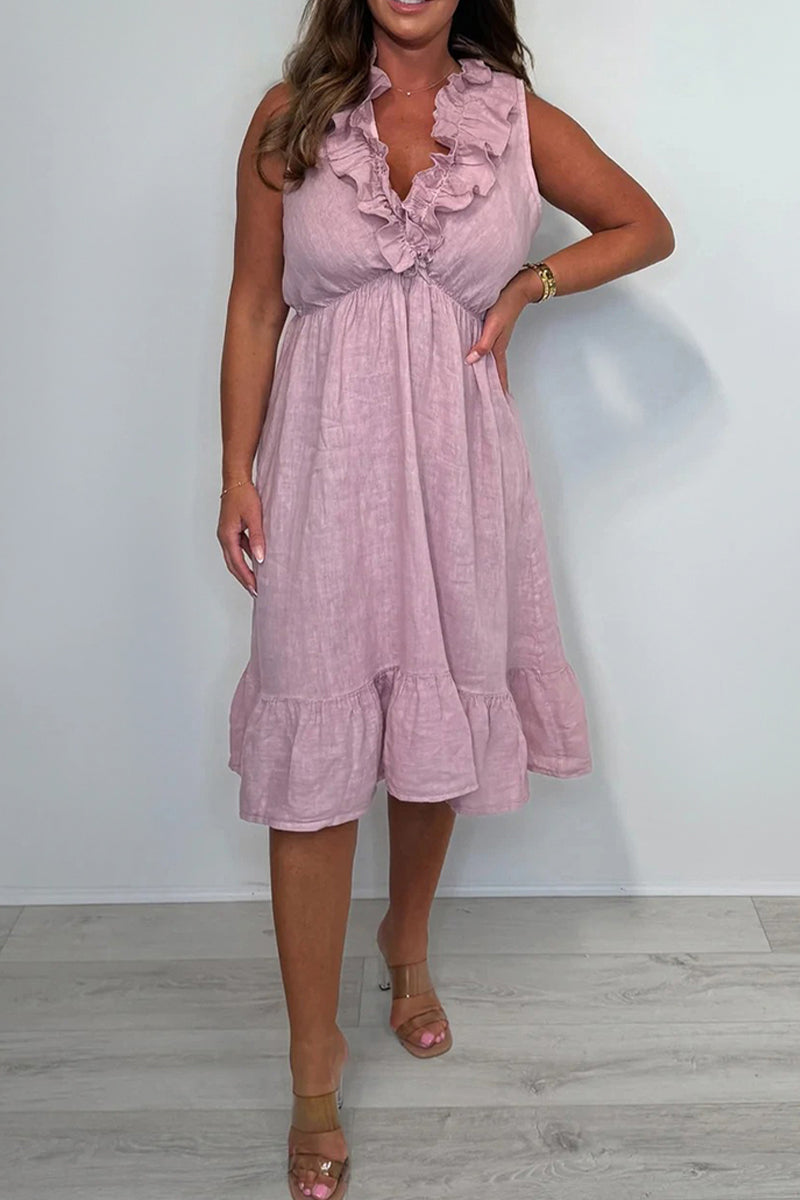 Women's Ruffle Trim Sleeveless V Neck Casual Flowy Pleated Mini Dress with Pockets