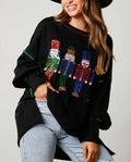 Bring some sparkle to your wardrobe during the holidays with this Christmas Sequin Nutcracker Sweatshirt. This unique design features gorgeous sequin nutcrackers, color block seam, long balloon sleeves, high-low hem, and a loose fit for maximum comfort. Are you ready to bring some joy to your closet this year?