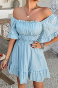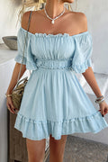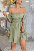 Get ready to romanticize seaside memories with this lightweight woven dress adorned with a pleated texture across the flare silhouette. Fluttery short sleeves add a touch of whimsy as they frame the off the shoulder neck bodice that sits atop an high elastic waist and a mini hem.
