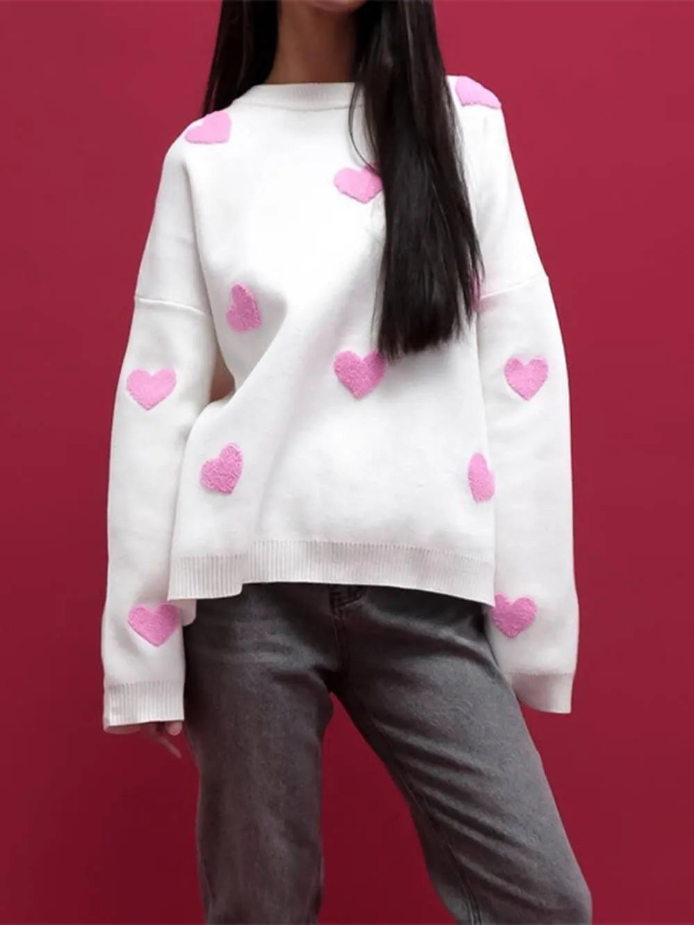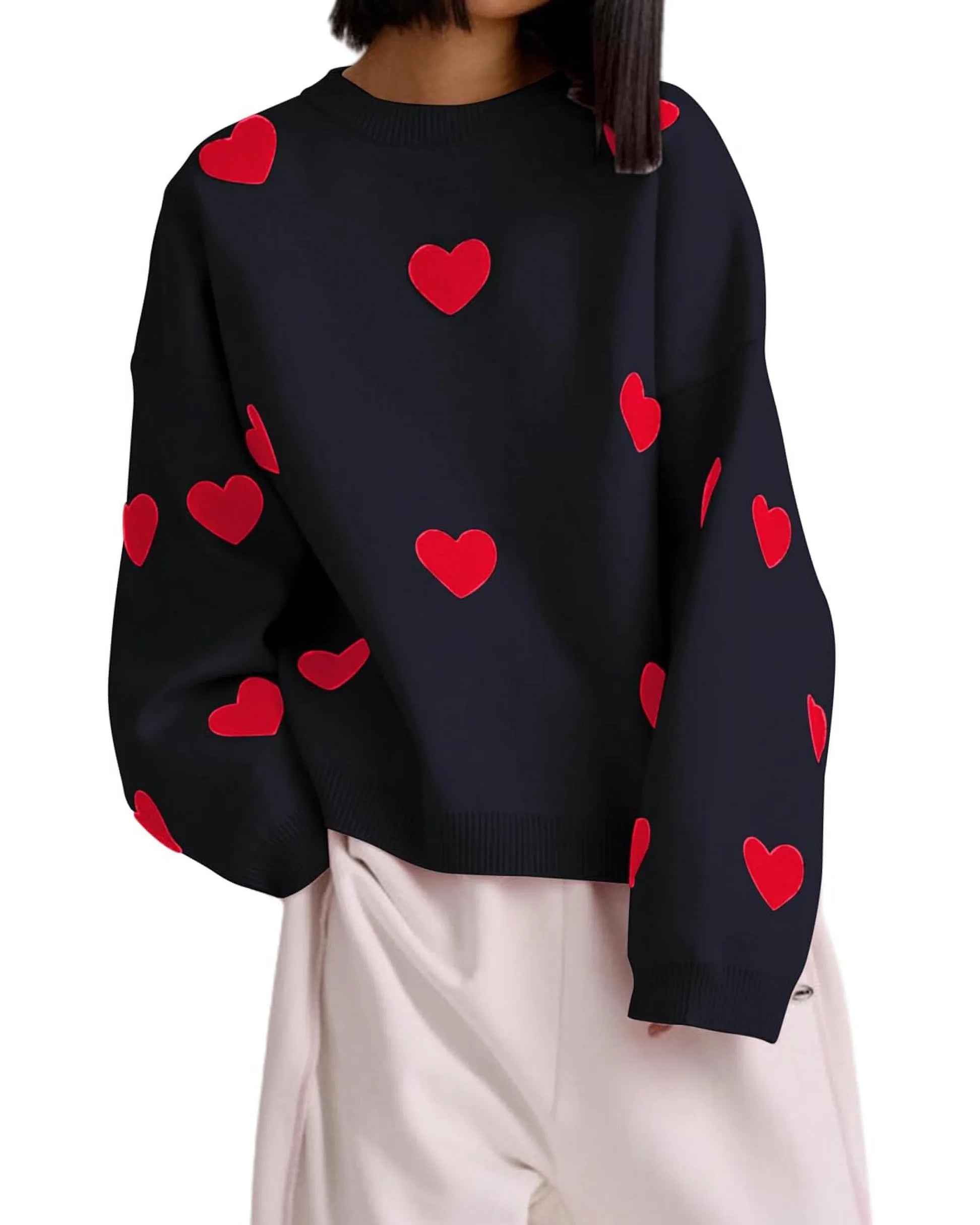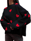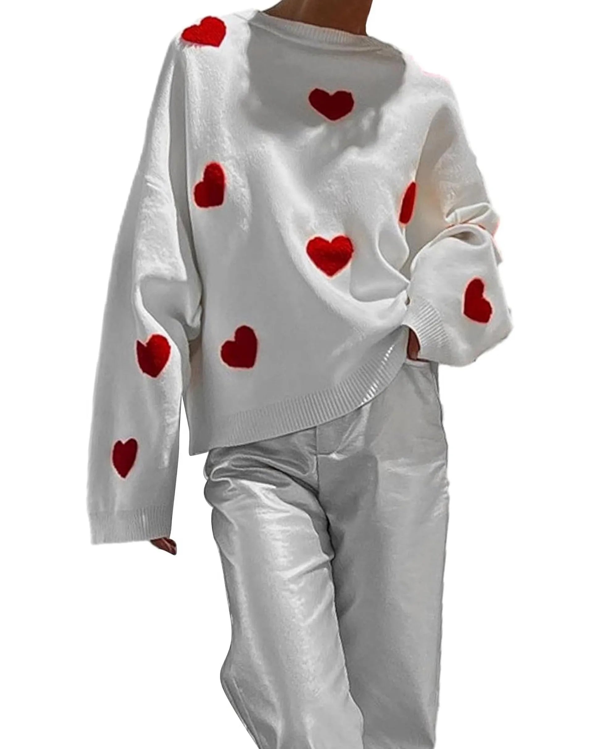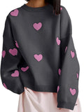 Adopt heart-shaped patchwork design,creating a cute and sweet atmosphere. Round neck ribbed trim heart-shaped pattern pullover sweater has a loose fit, paired with trousers, shorts, skirts, jeans, it is very suitable for Valentine's Day date, daily life, vacation and photo taking.