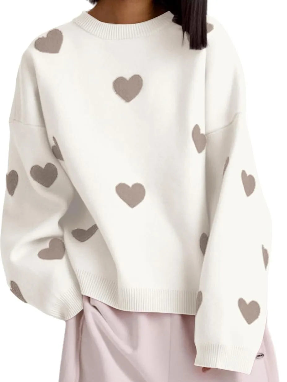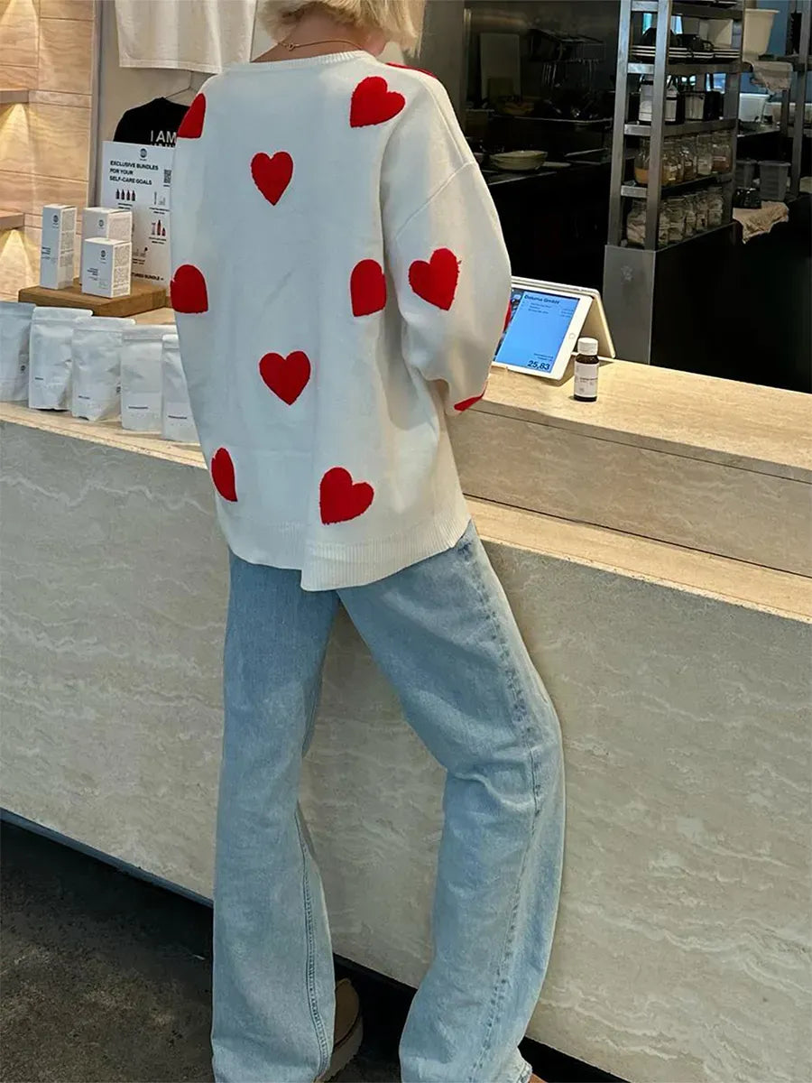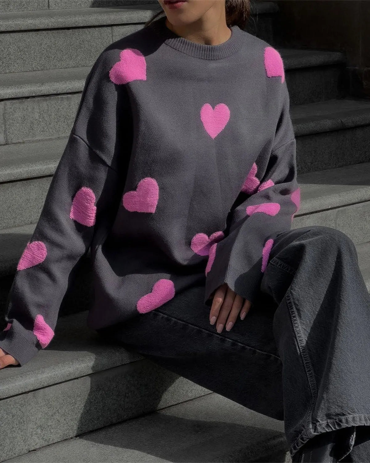 Adopt heart-shaped patchwork design,creating a cute and sweet atmosphere. Round neck ribbed trim heart-shaped pattern pullover sweater has a loose fit, paired with trousers, shorts, skirts, jeans, it is very suitable for Valentine's Day date, daily life, vacation and photo taking.