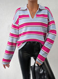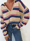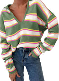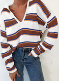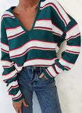 Get cozy in style with our V Neck Striped Pullover. With a classic V neckline and long sleeves, this oversized pullover offers a slouchy silhouette for a comfortable yet trendy look.