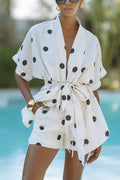 From running errands to covering up after a long day sitting poolside, this Grace and Beauty Polka Dots Short Sleeve Suit was meant to do it all. The classic wrap silhouette features a slightly oversized fit with a collared neckline and short sleeves with drop shoulders and fitted cuffs, creating a perfectly casual look. Pair with the matching shorts for a complete look!