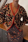 Perfect for Winter Leopard Cherry Print Knitted Button Long Sleeve Loose Cardigan