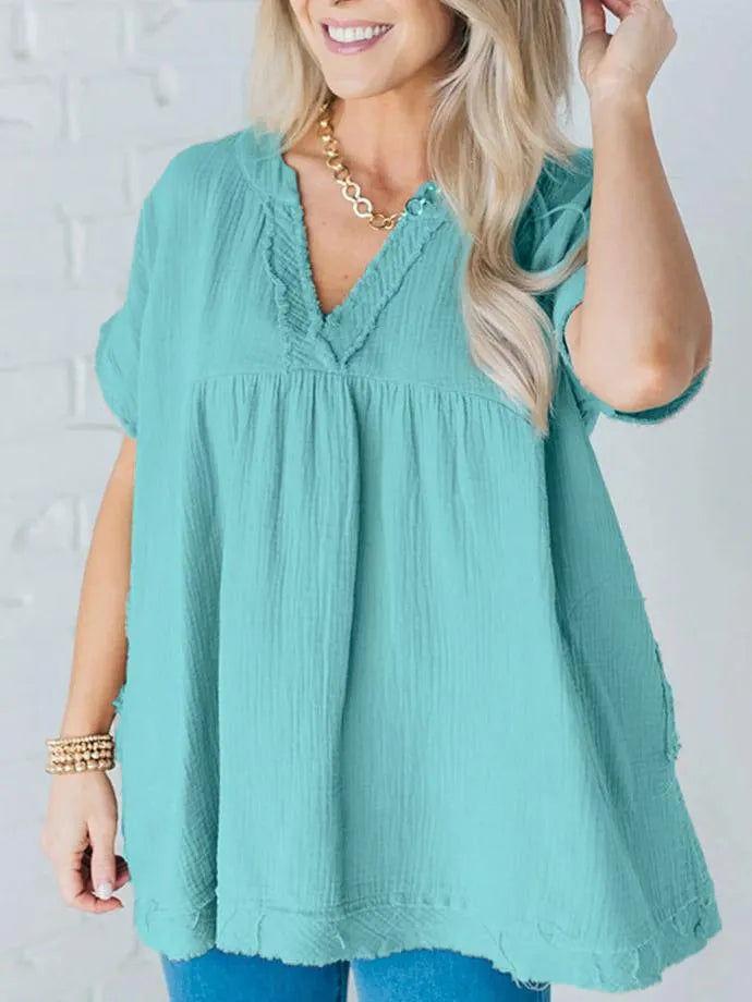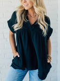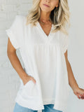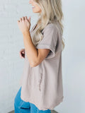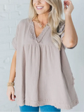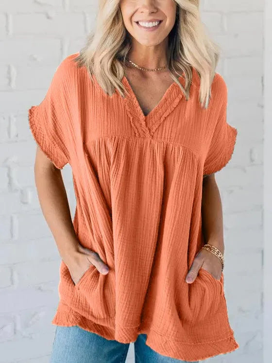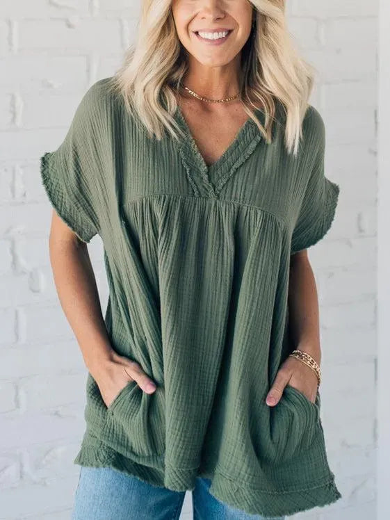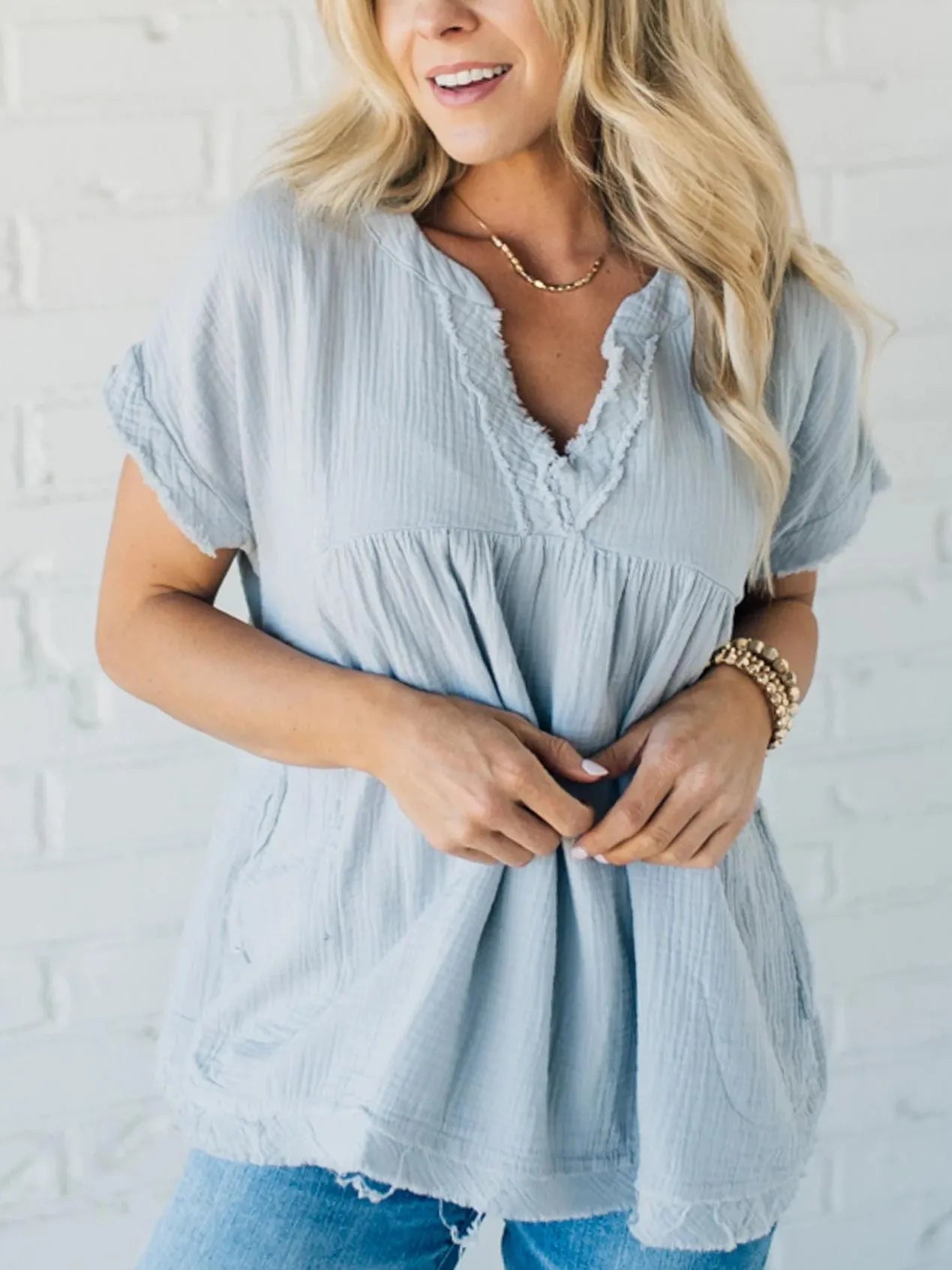 Lightweight gauzy top with a pocket on each side, and a raw edge, straight hem! This cozy top can be dressed up with jeans and booties, or throw her on with leggings and slippers for the perfect get-things-done look!