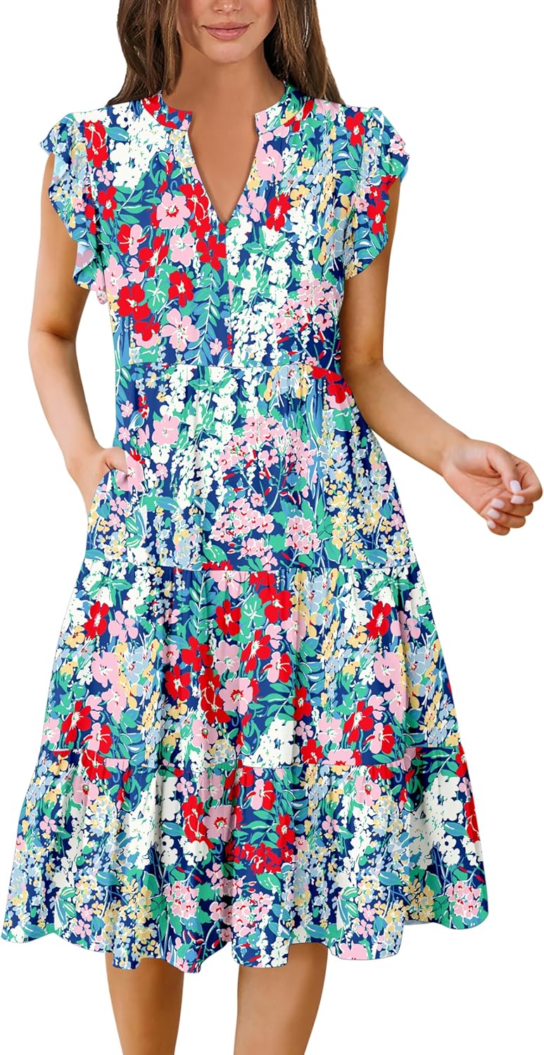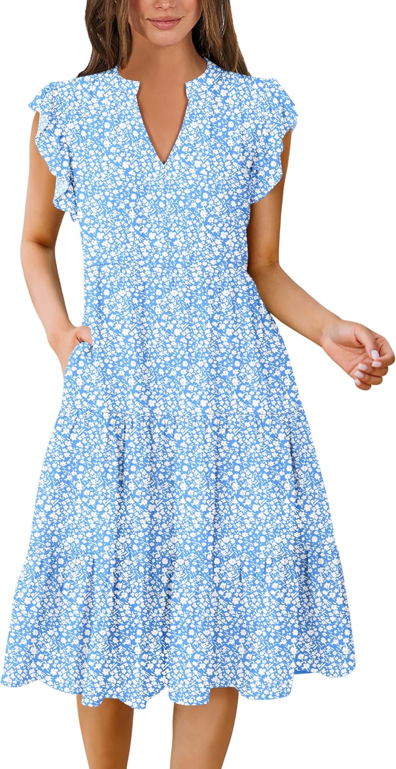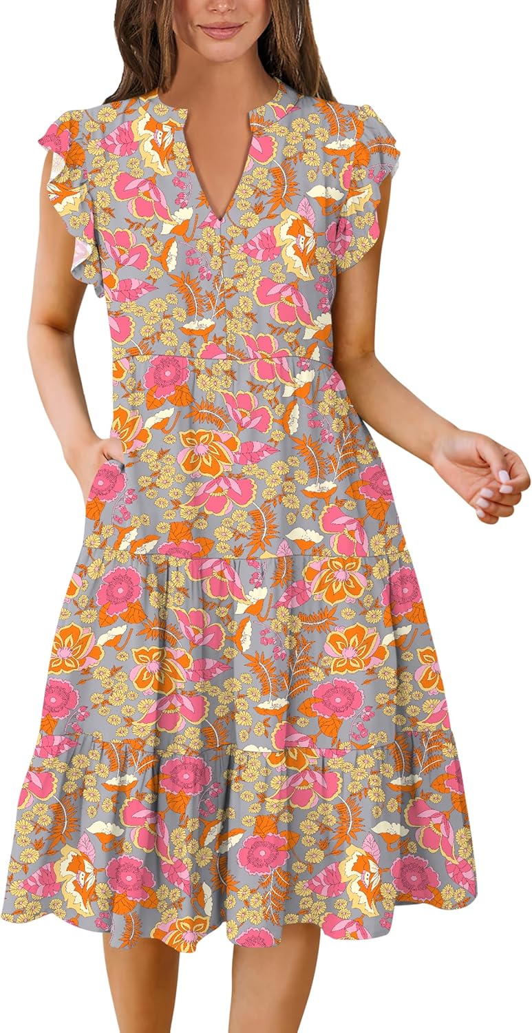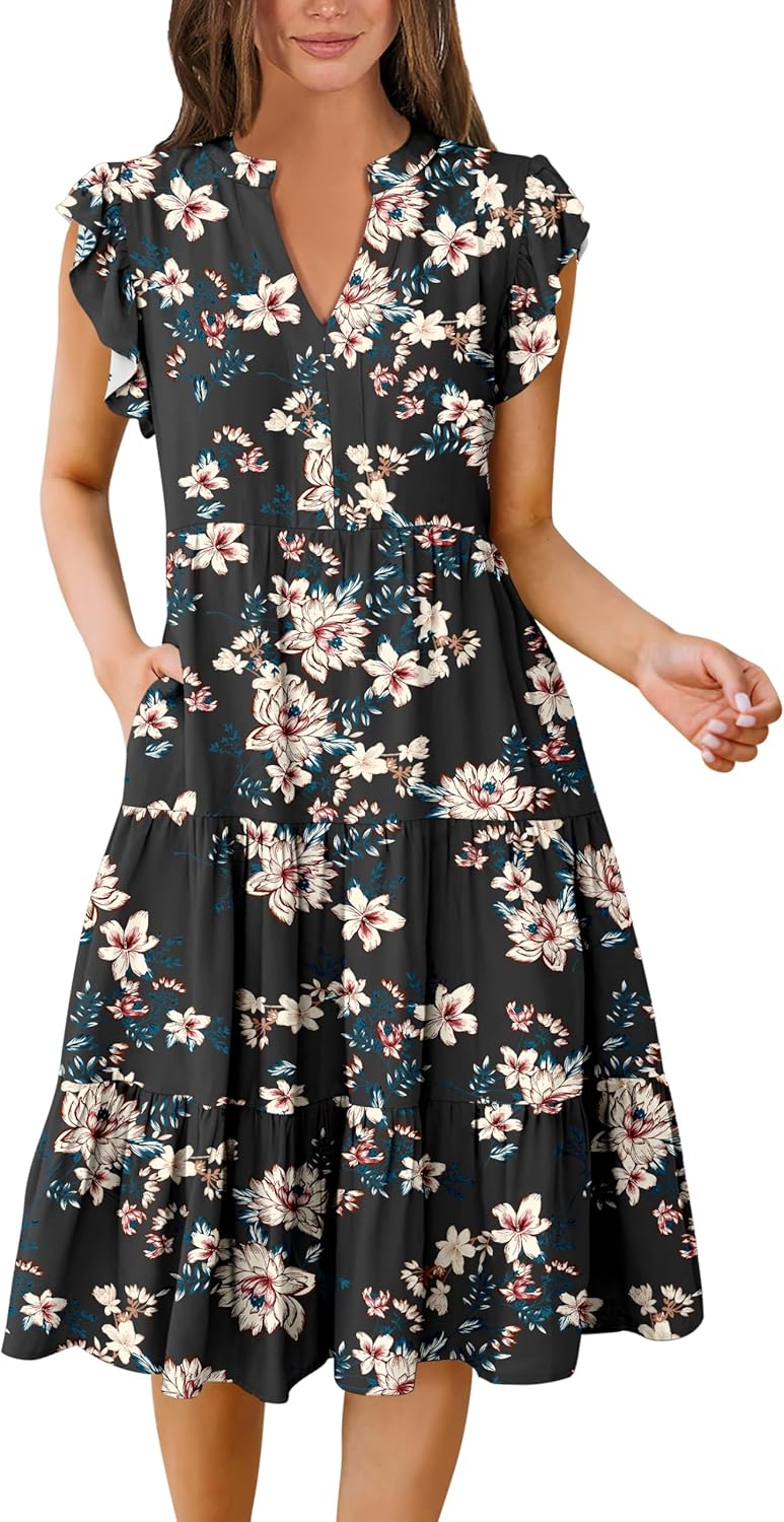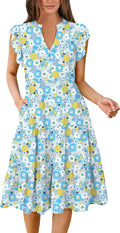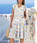 Ruffle Sleeve V Neck Fit Flowy Tiered Midi Dresses
