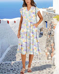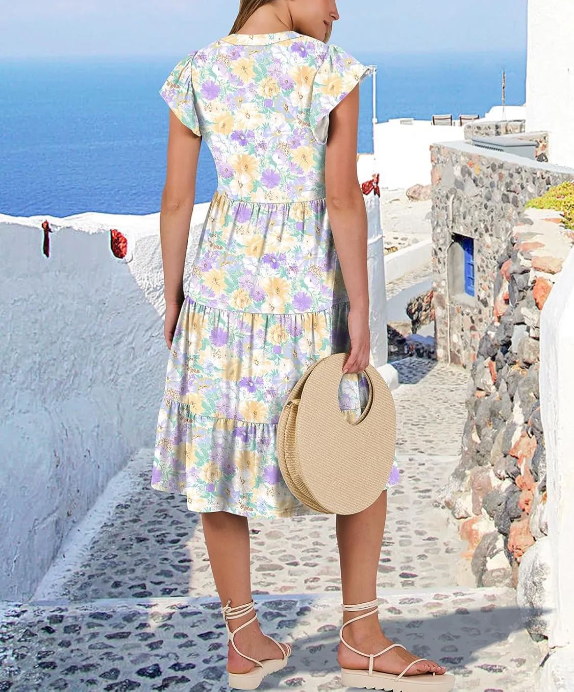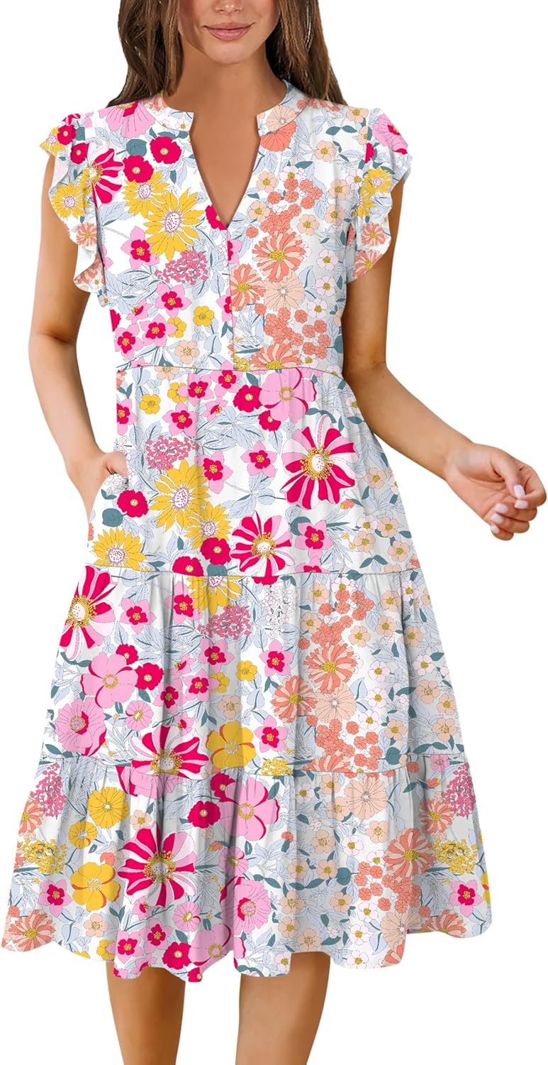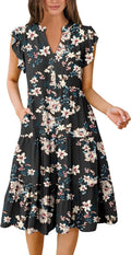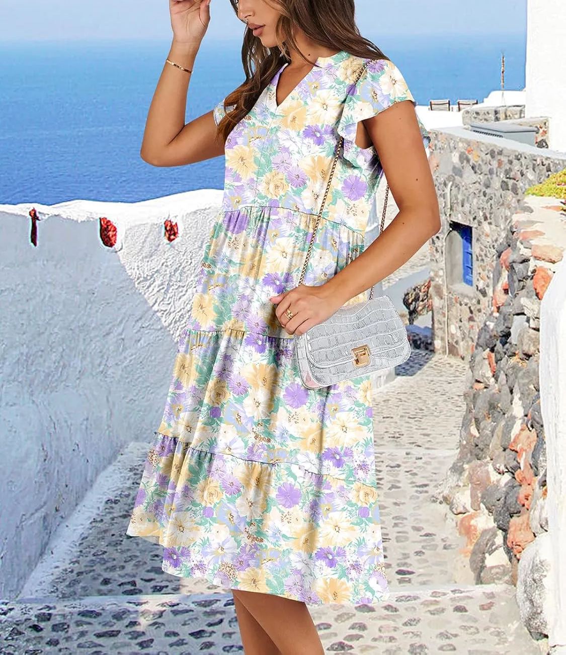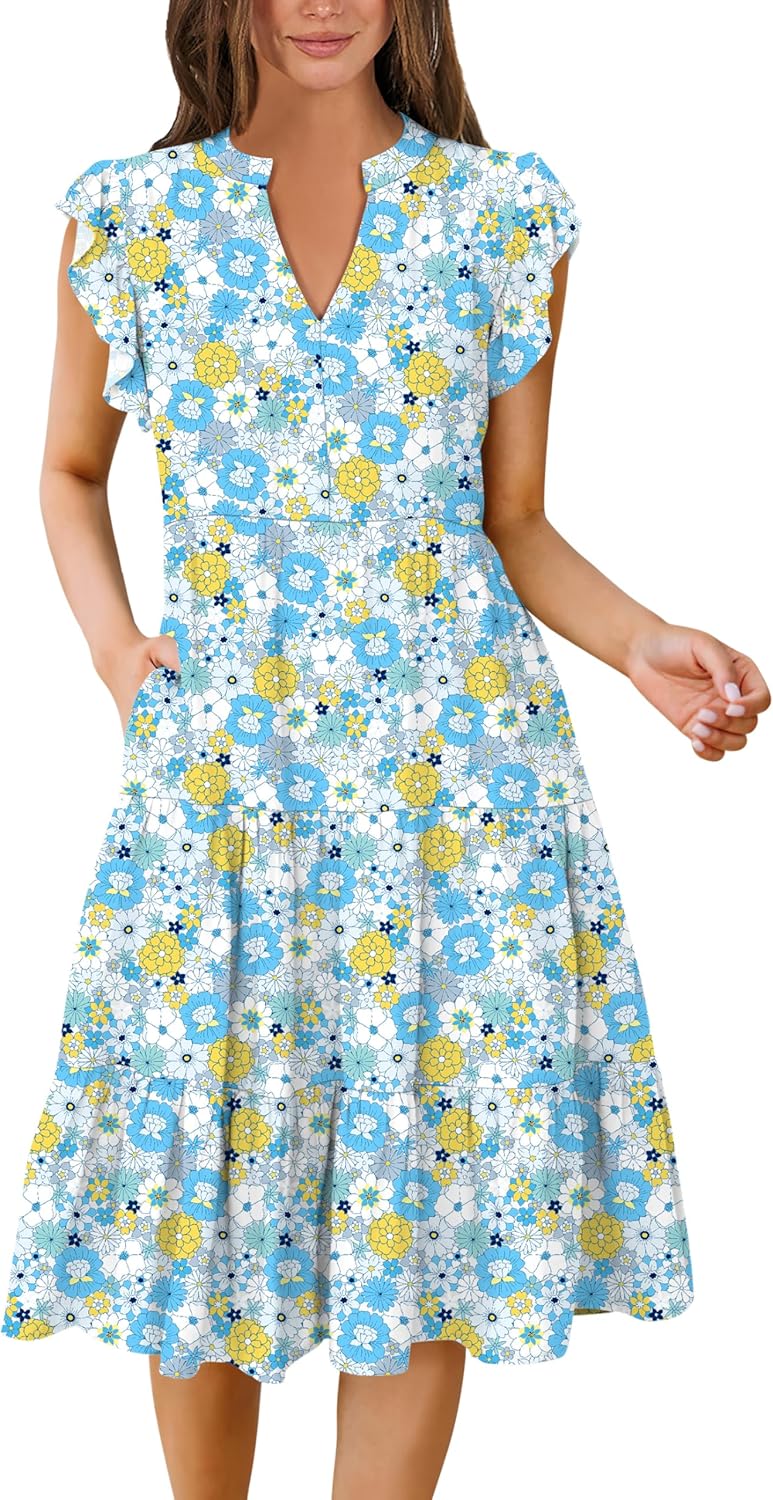 Ruffle Sleeve V Neck Fit Flowy Tiered Midi Dresses