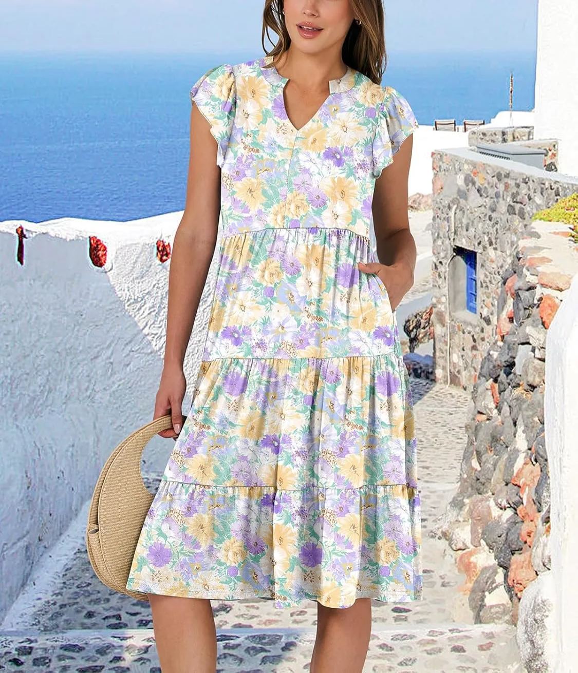 Elevate your style with our Ruffle Sleeve V Neck Fit Flowy Tiered Midi Dresses. Perfect for any occasion, these dresses feature a flattering fit and a trendy tiered design. Stay chic and comfortable in this must-have wardrobe staple.