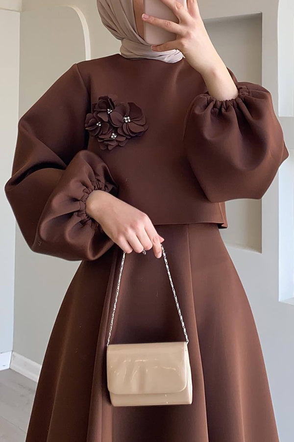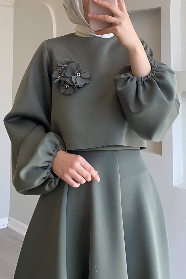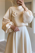 Solid Color Flower-embellished Lantern Sleeve Loose Top and Casual Maxi Skirt Set
