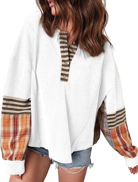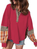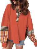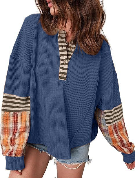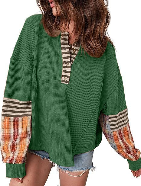Stripe Plaid Patchwork Waffle Knit Henley Top