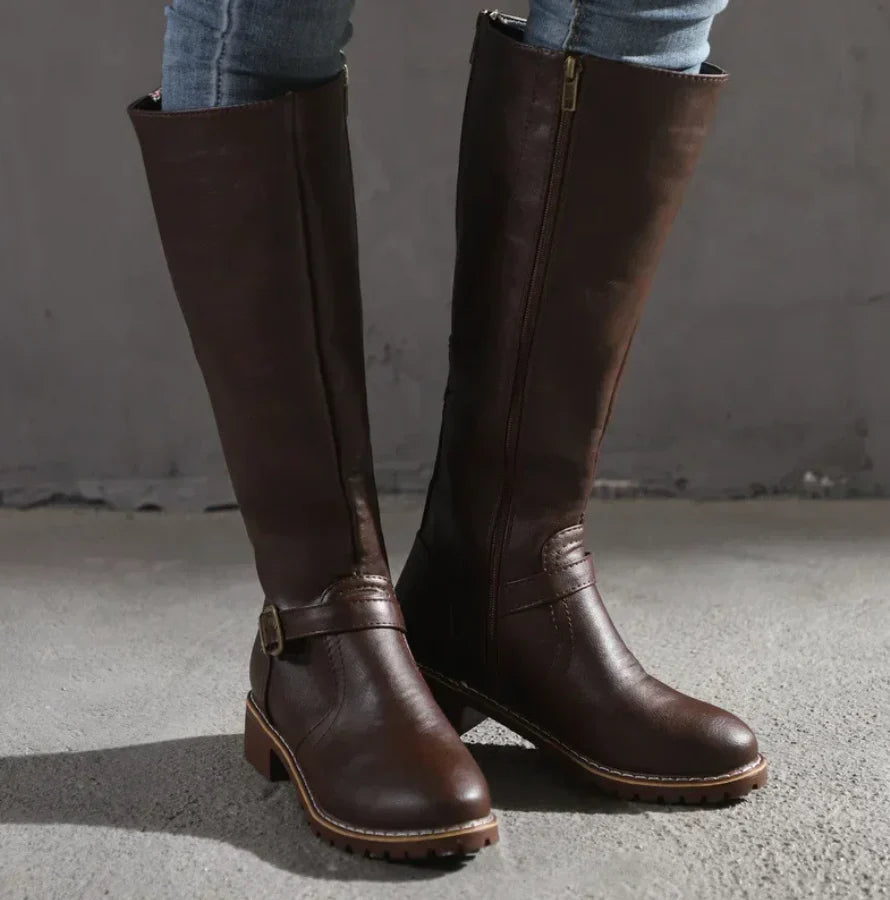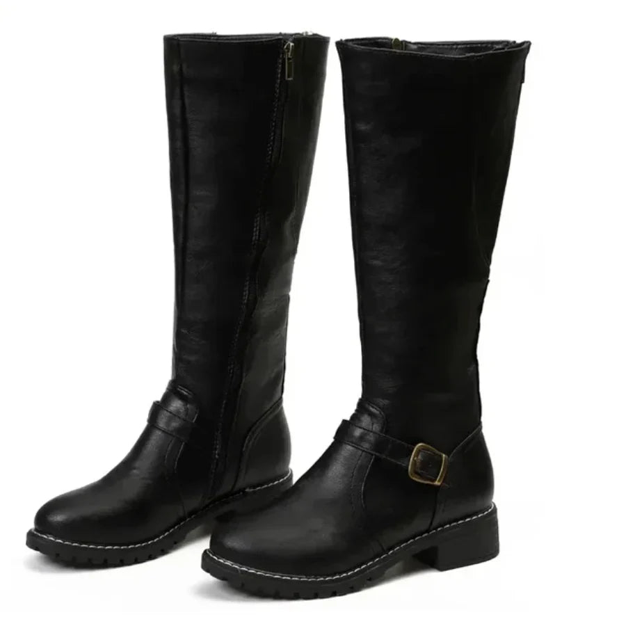 These women’s knee high boots showcase a timeless design complemented by a stylish buckle strap detail, adding a touch of elegance. The sturdy low block heel provides all-day comfort while maintaining a chic and versatile look, making them perfect for pairing with jeans, leggings, or dresses.