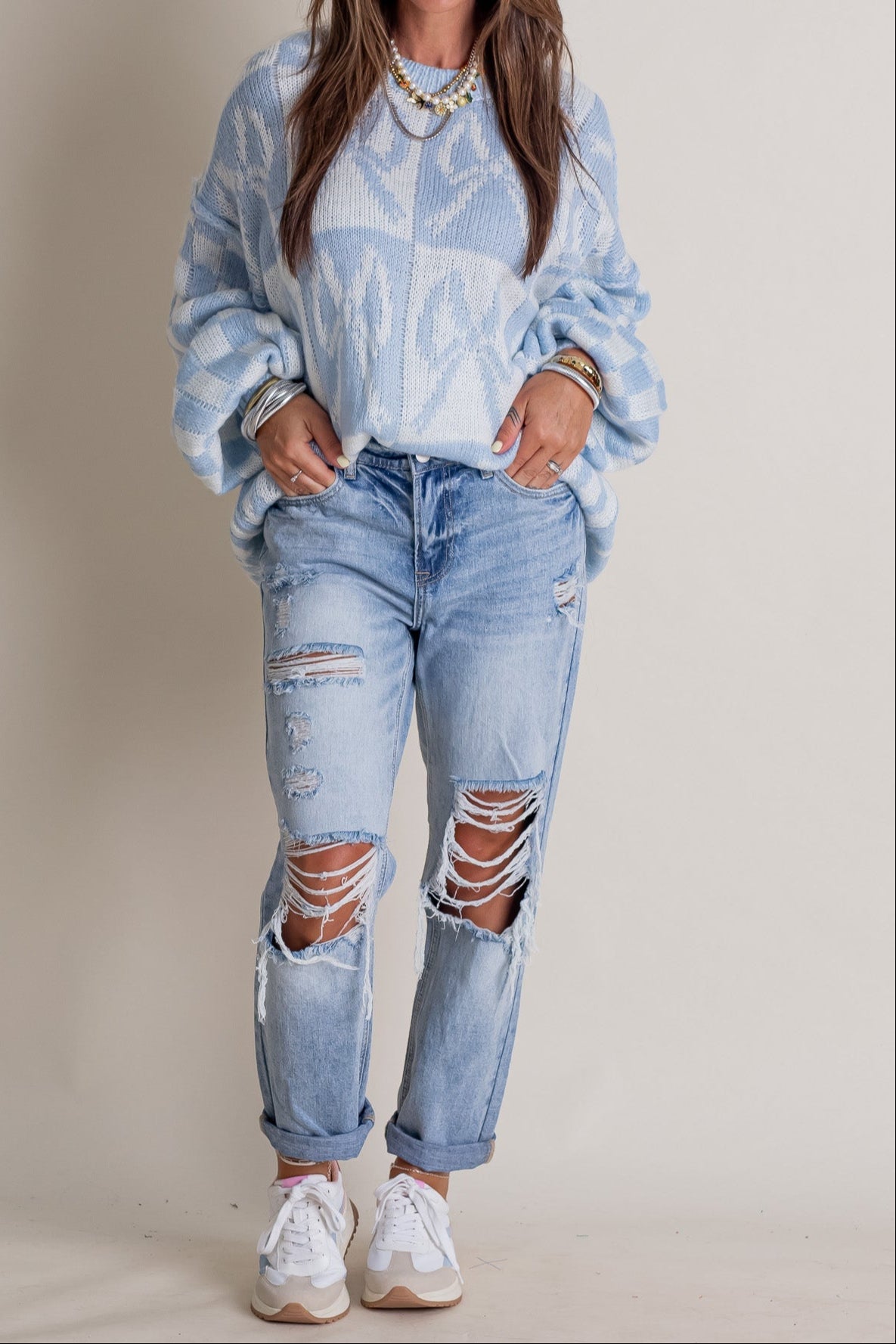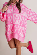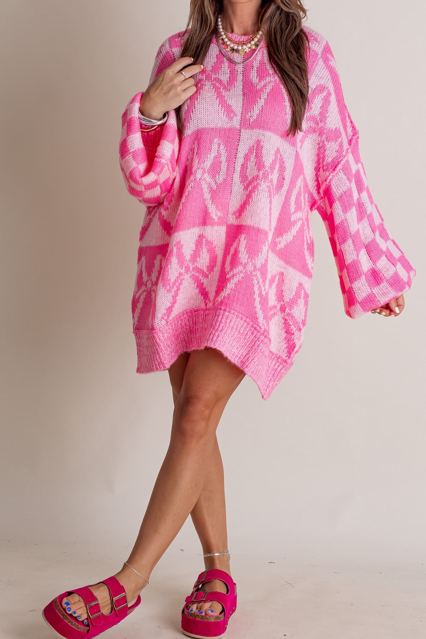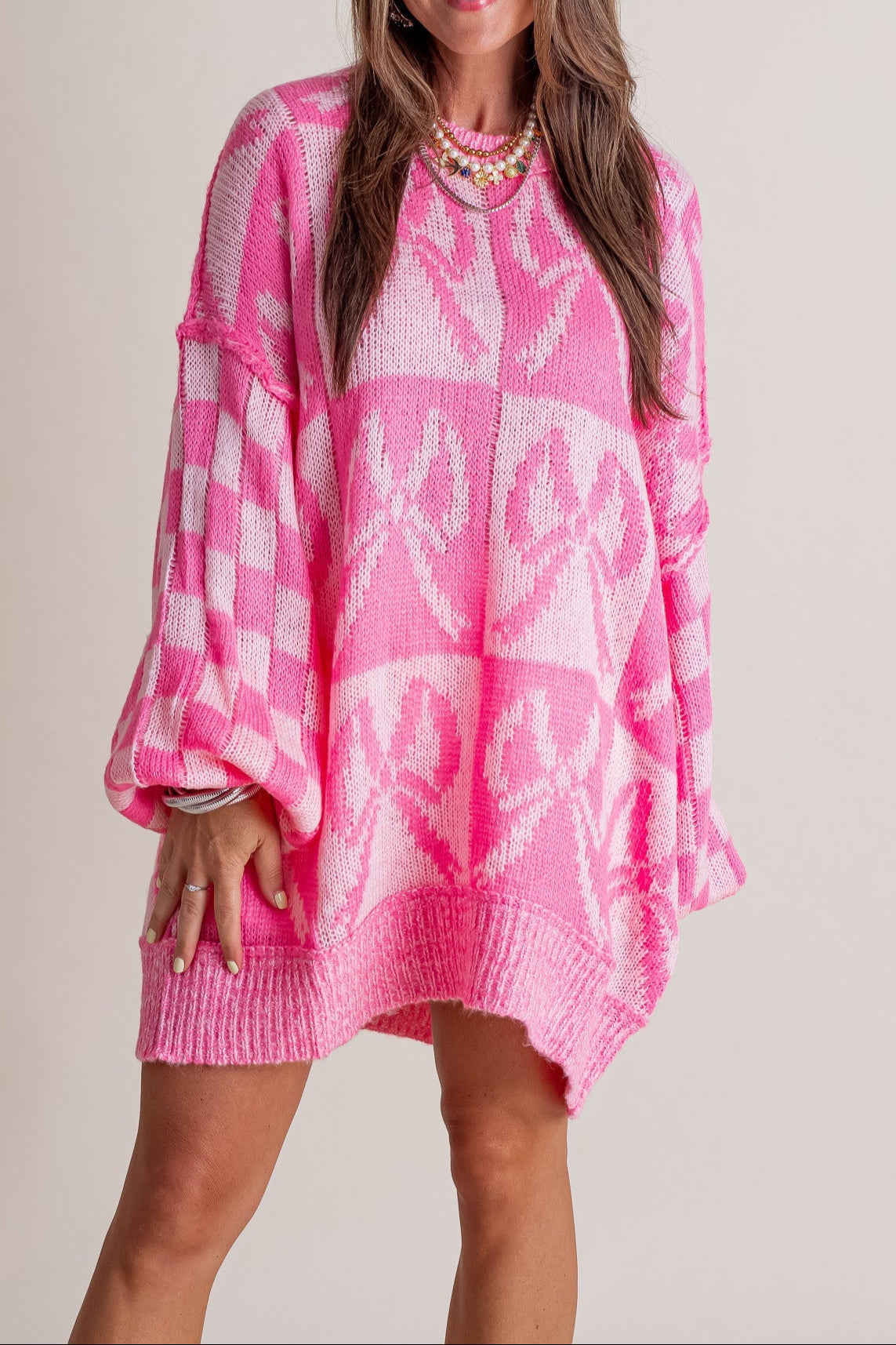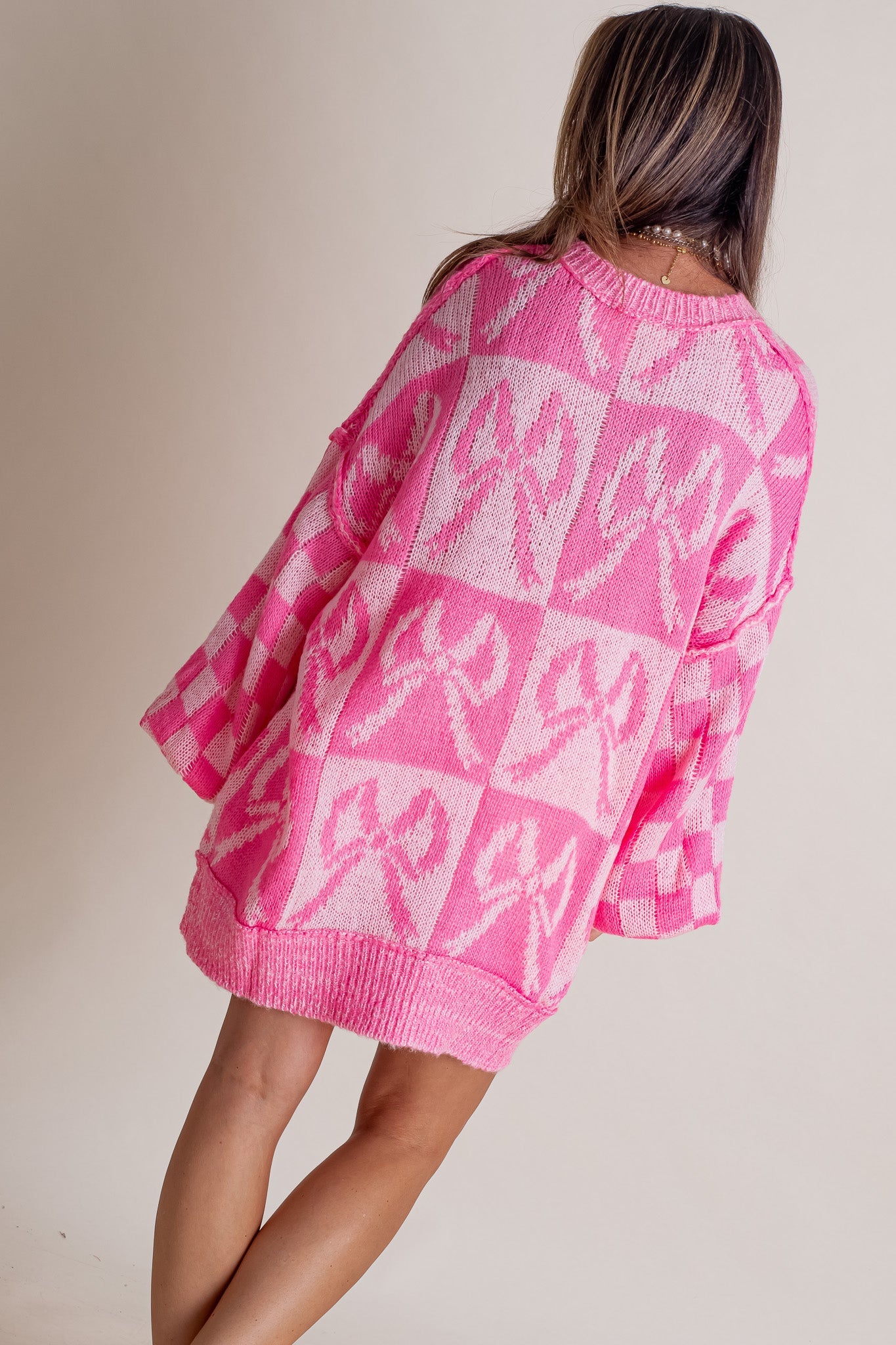 Expertly crafted and stylish, the Sweet Days Checkered Sweater offers a versatile addition to any wardrobe. Made with a pink checked pattern, bows, and raw edge seams, this oversized sweater features smaller checked sleeves and a ribbed trim for added comfort. Stay warm and on-trend with this cozy sweater. Limited stock and available in sizes small through large!
