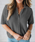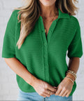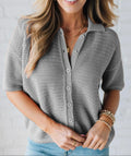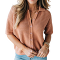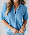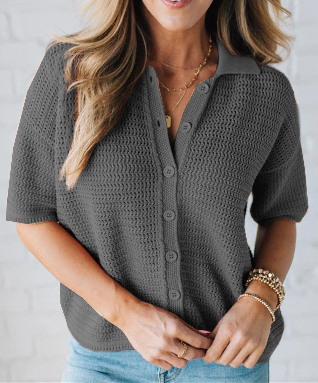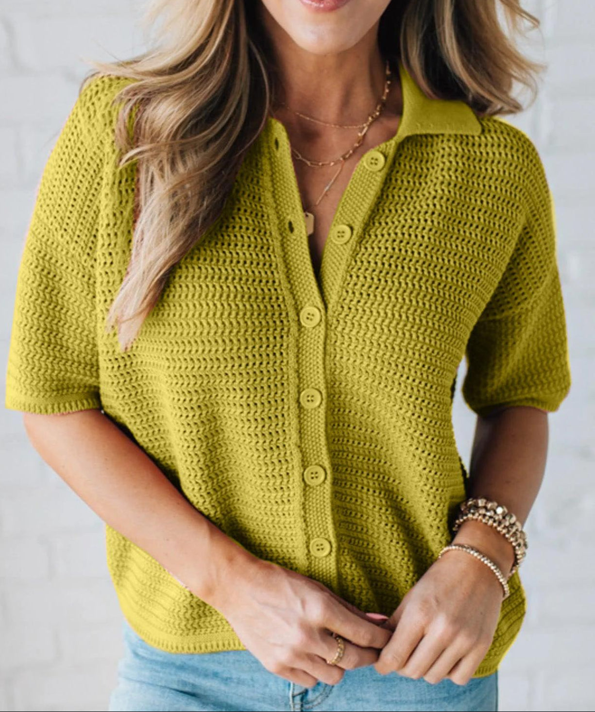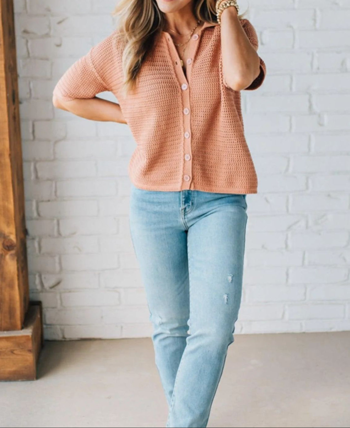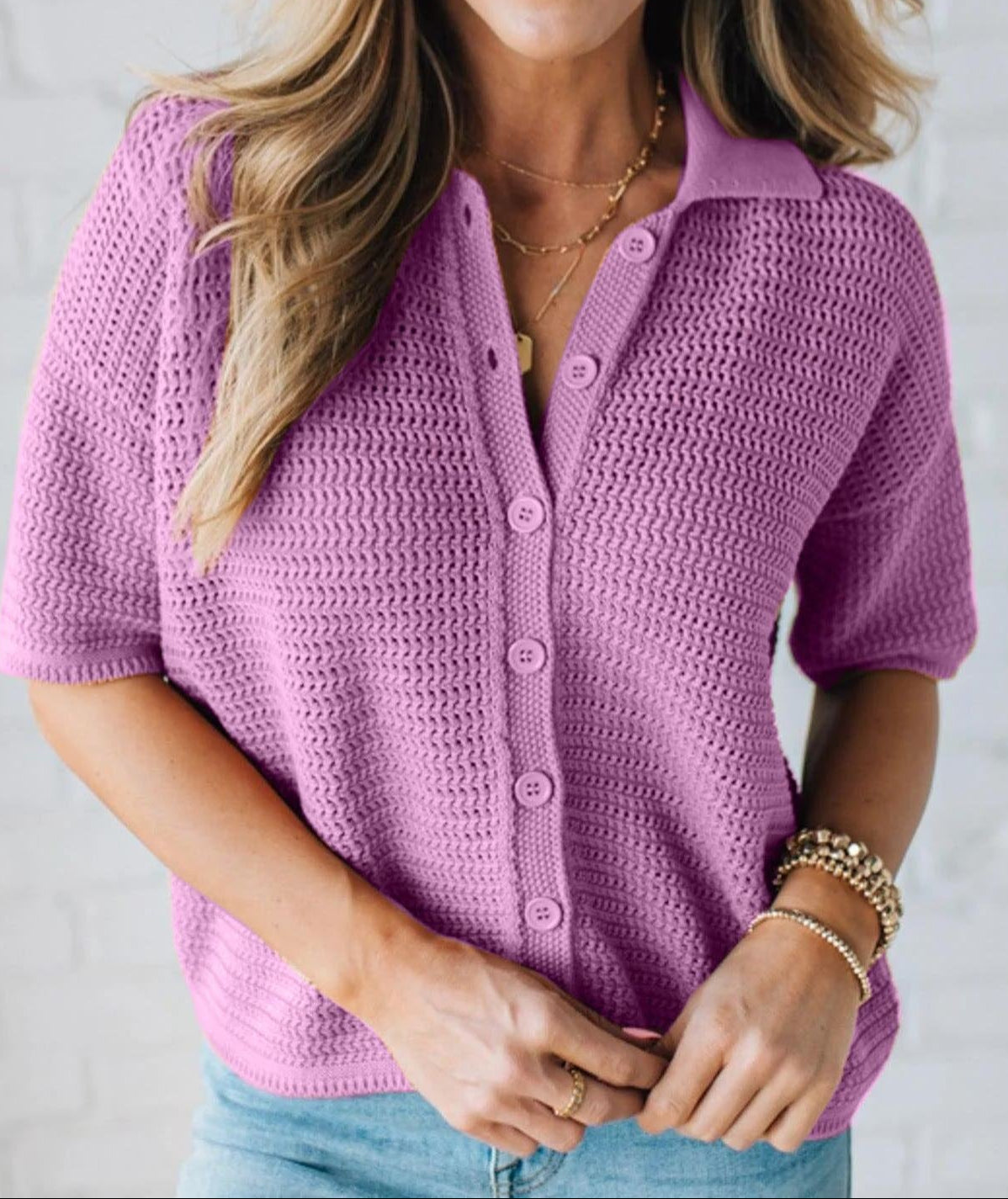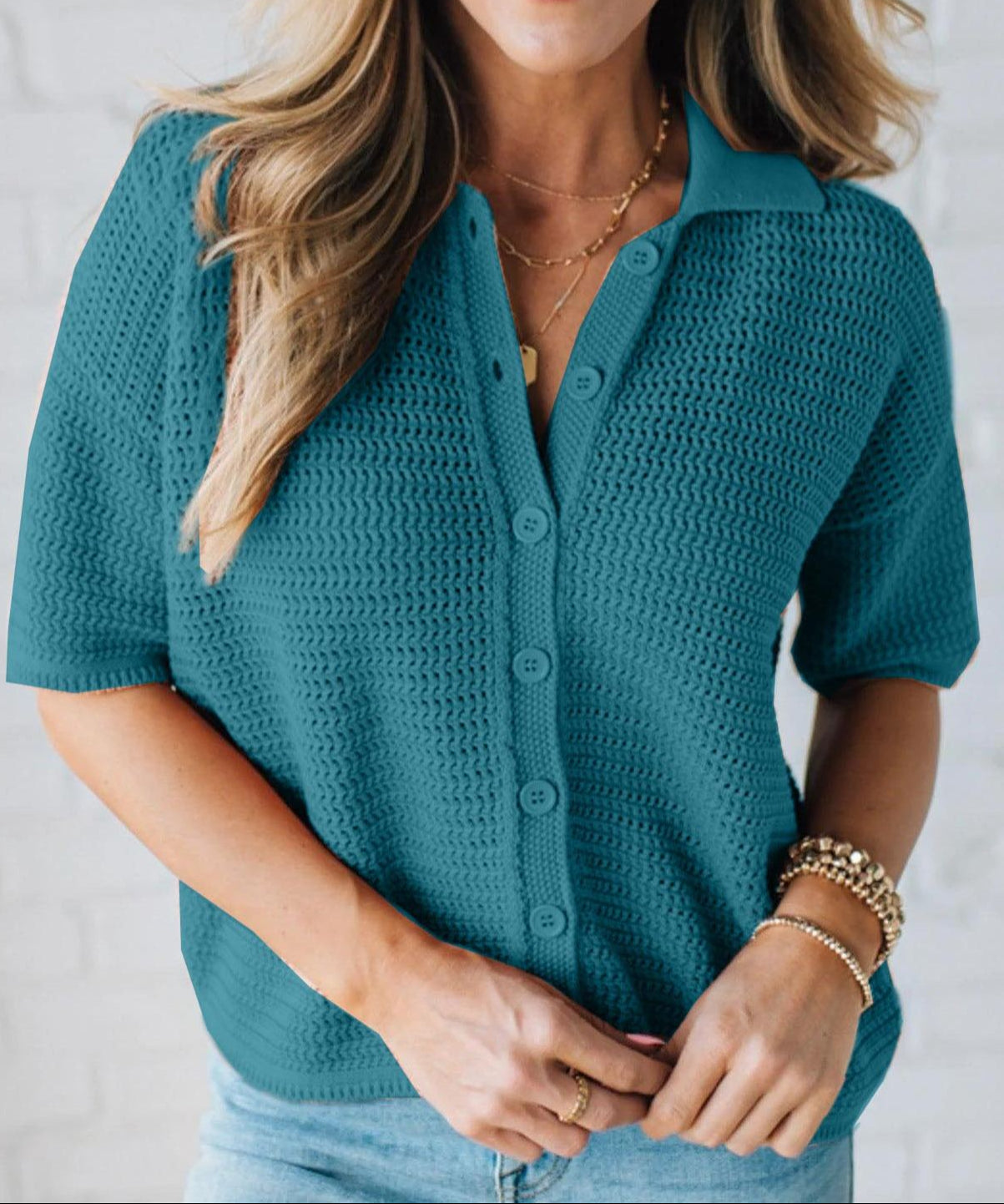 Get ready to elevate your summer wardrobe with our Crissy Crochet Top! This playful, short-sleeved sweater features a unique button-up, collared shirt style with a drop shoulder design and relaxed, boxy fit. Made from soft cotton, it's perfect for a breezy and stylish look. (Pun-fully) crochet your way to effortless fashion with this must-have piece.