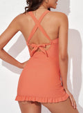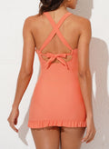 Feel confident, supported, and stylish in this 2-Piece Skirted Tankini Swimdress – a perfect blend of retro charm and modern comfort. Designed with a twist-front V-neck, criss-cross open back, and a flattering ruched skirted top, it brings out your curves while offering full tummy coverage and a secure fit.