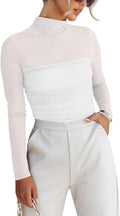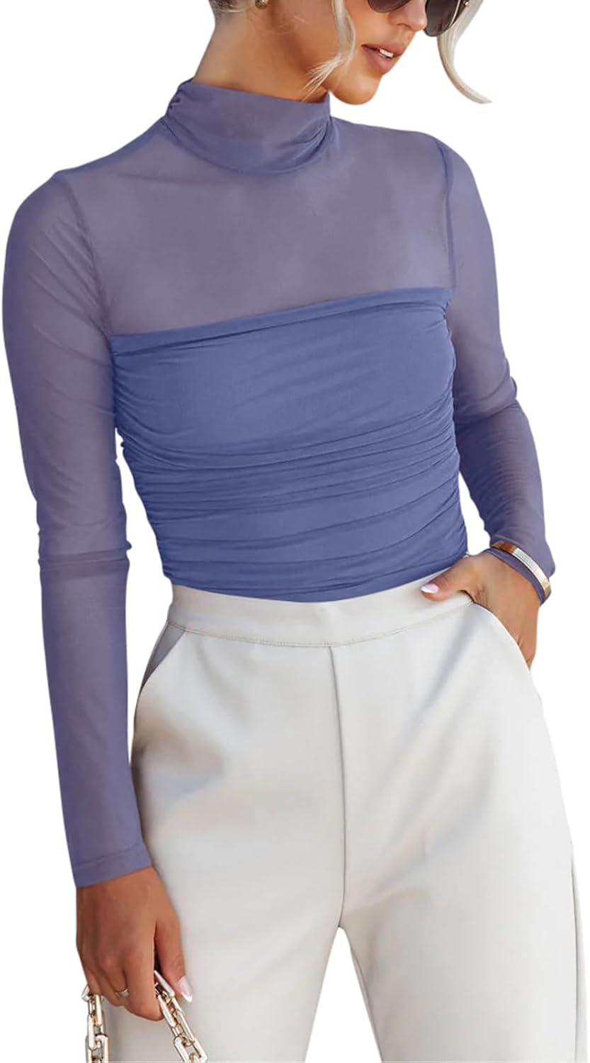 Women’s Trendy Sexy Mock Turtle Neck Long Sleeve Sheer Mesh Ruched Going Out Bodysuits Tops