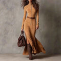 This maxi dress features a fitted bodice with a zip-front neckline that creates a clean, elongated look. The belted waist shapes the silhouette and draws attention to the upper line of the hips. A high slit at the skirt adds movement, giving the dress a sweeping effect with every step.
