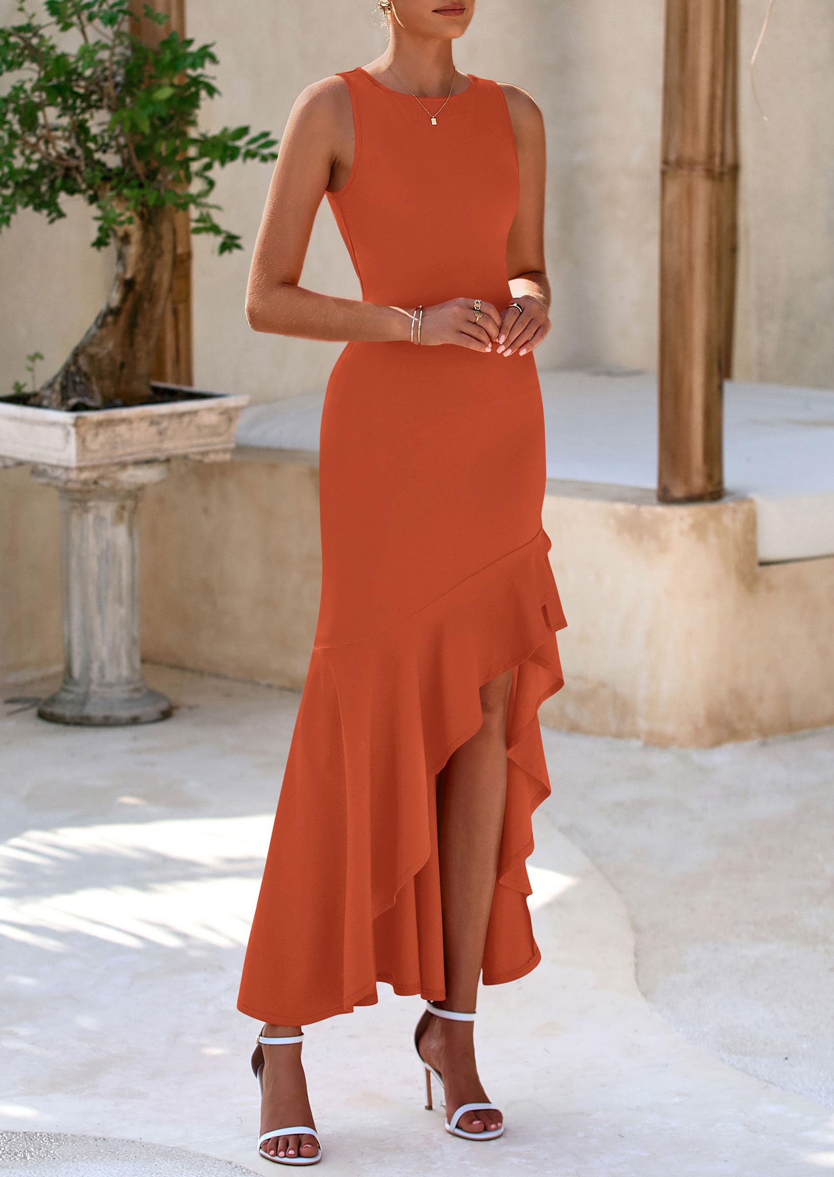 Unleash your inner goddess with this Mermaid Hem Sleeveless Maxi Dress, crafted for unforgettable entrances and elegant silhouettes. With a smooth bodycon fit, soft fabric, and dramatic high-low ruffle hem, this is a look that speaks volumes — without saying a word.