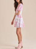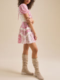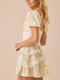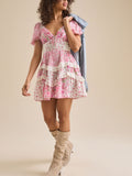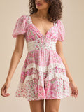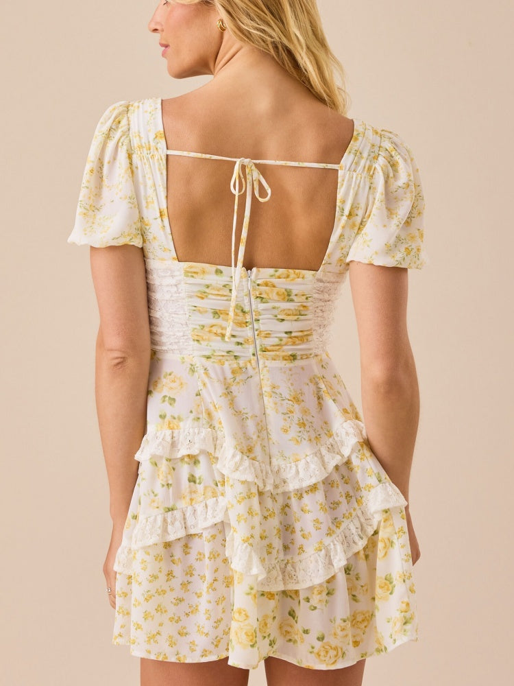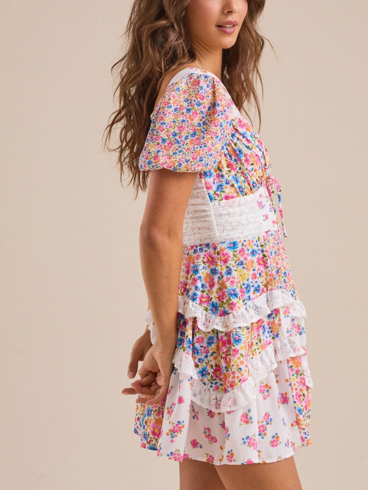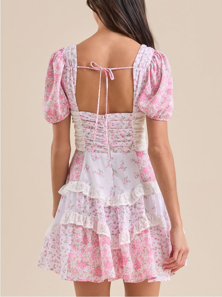 This floral mini dress features puff sleeves, a soft V-neckline, and delicate lace trim for a romantic, vintage-inspired look. Perfect for sunshine-filled days and sweet weekend plans.