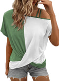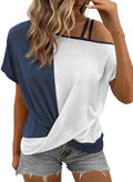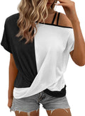 Women Twist Knot Color Block Loose Fit Cold Shoulder Tops