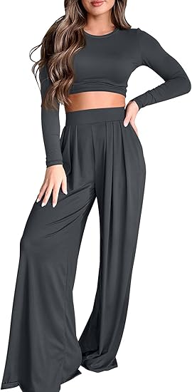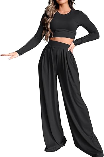 This long sleeve going out cropped tops is designed to enhance the waistline, providing a slimming effect. The palazzo pants offer casual style and fashionable flair. Together, they create a coordinated and fashionable ensemble.