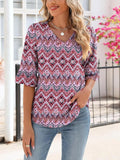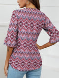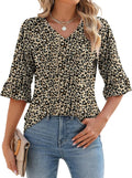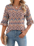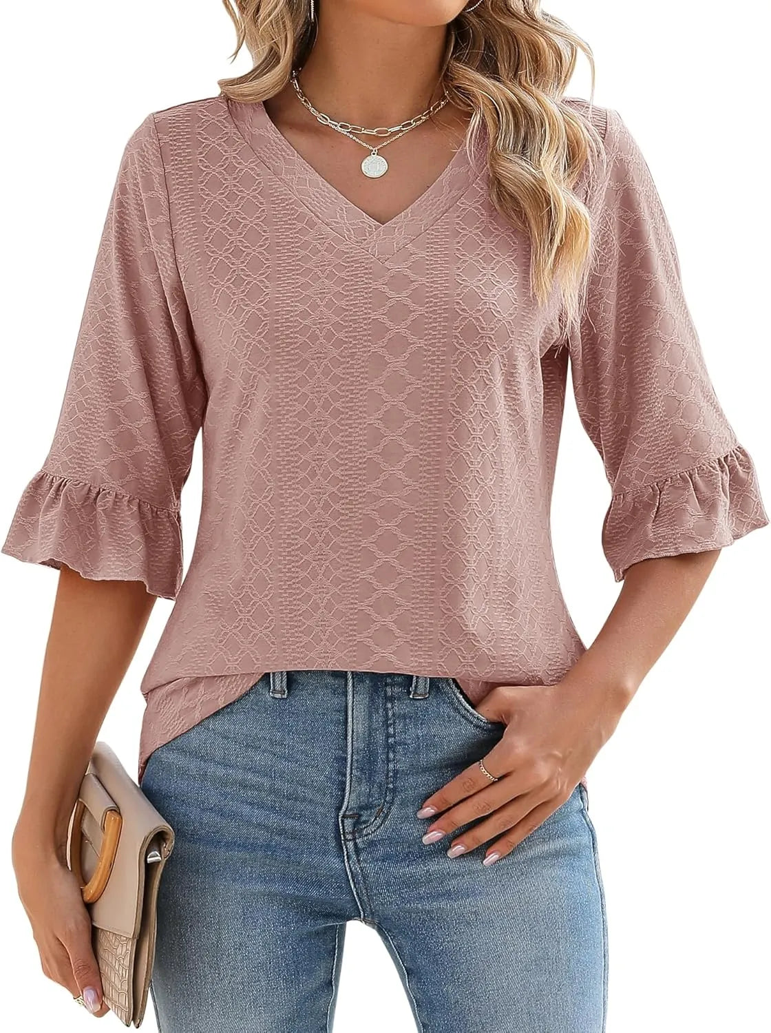 Womens 3/4 Length Sleeve V-Neck Eyelet Casual Ruffle Sleeve Tunic Blouses