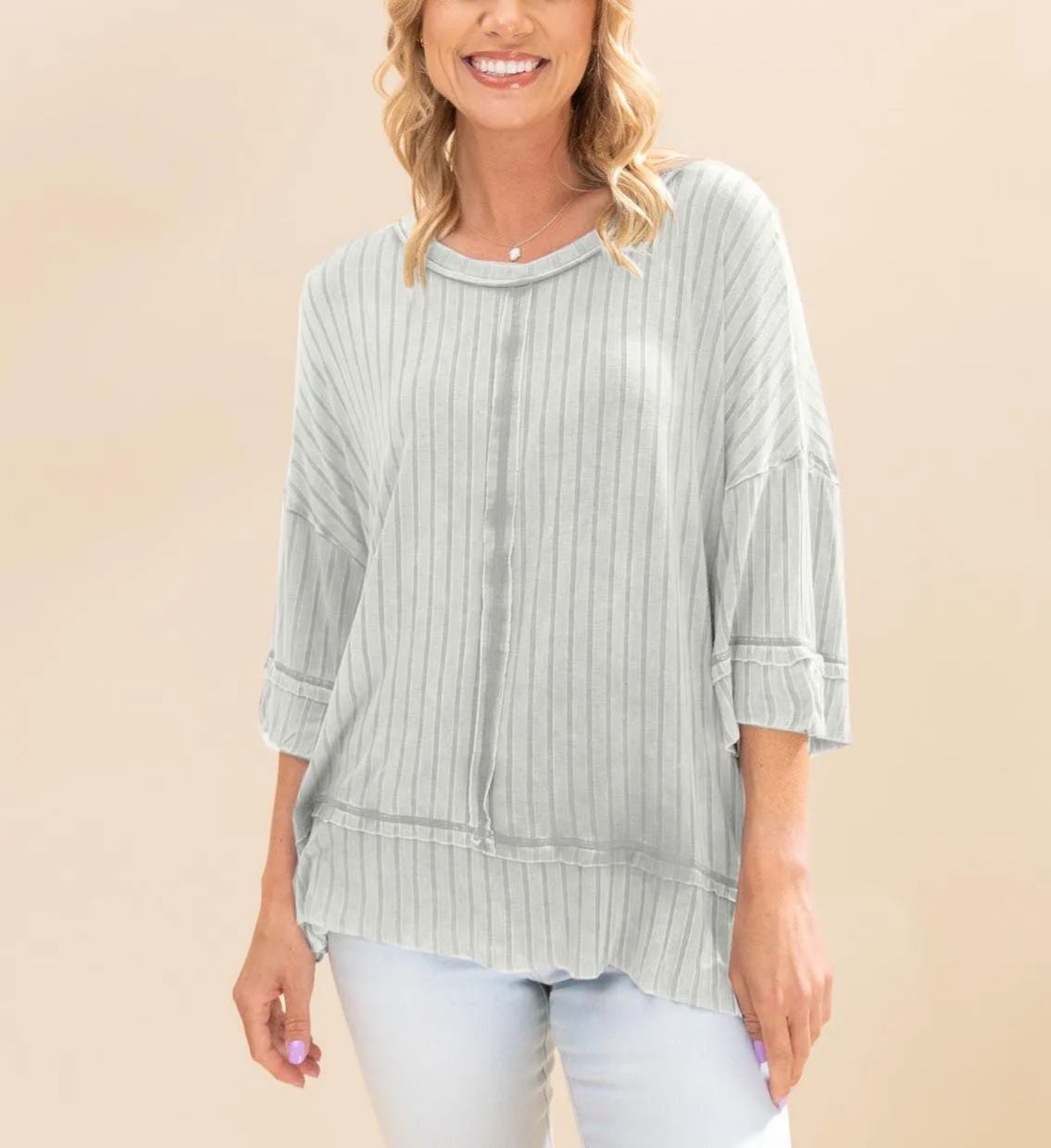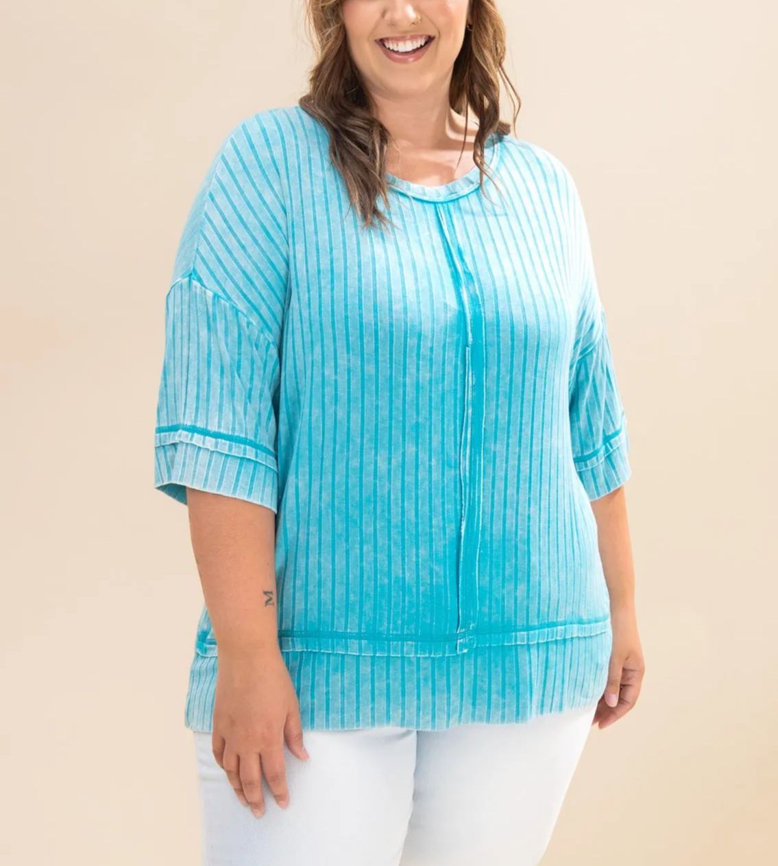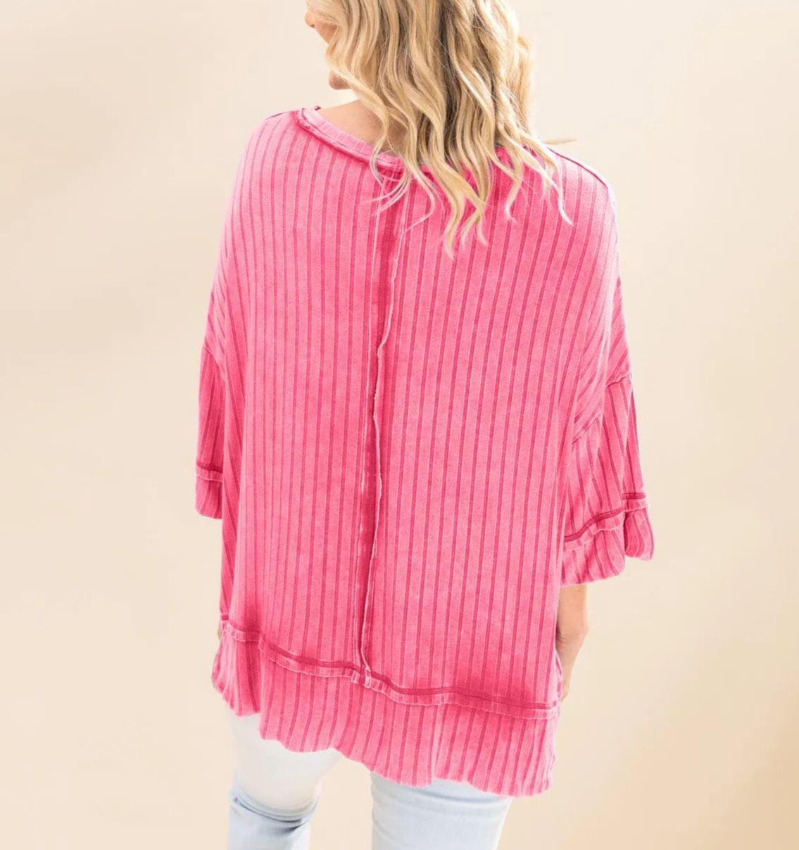 Made with washed ribbed fabric and featuring exposed seam detail, this top will add a unique touch to any outfit. With a boat-neck and drop shoulder, it offers a relaxed and flattering fit. Each top is one-of-a-kind, with variations in color and finishing.