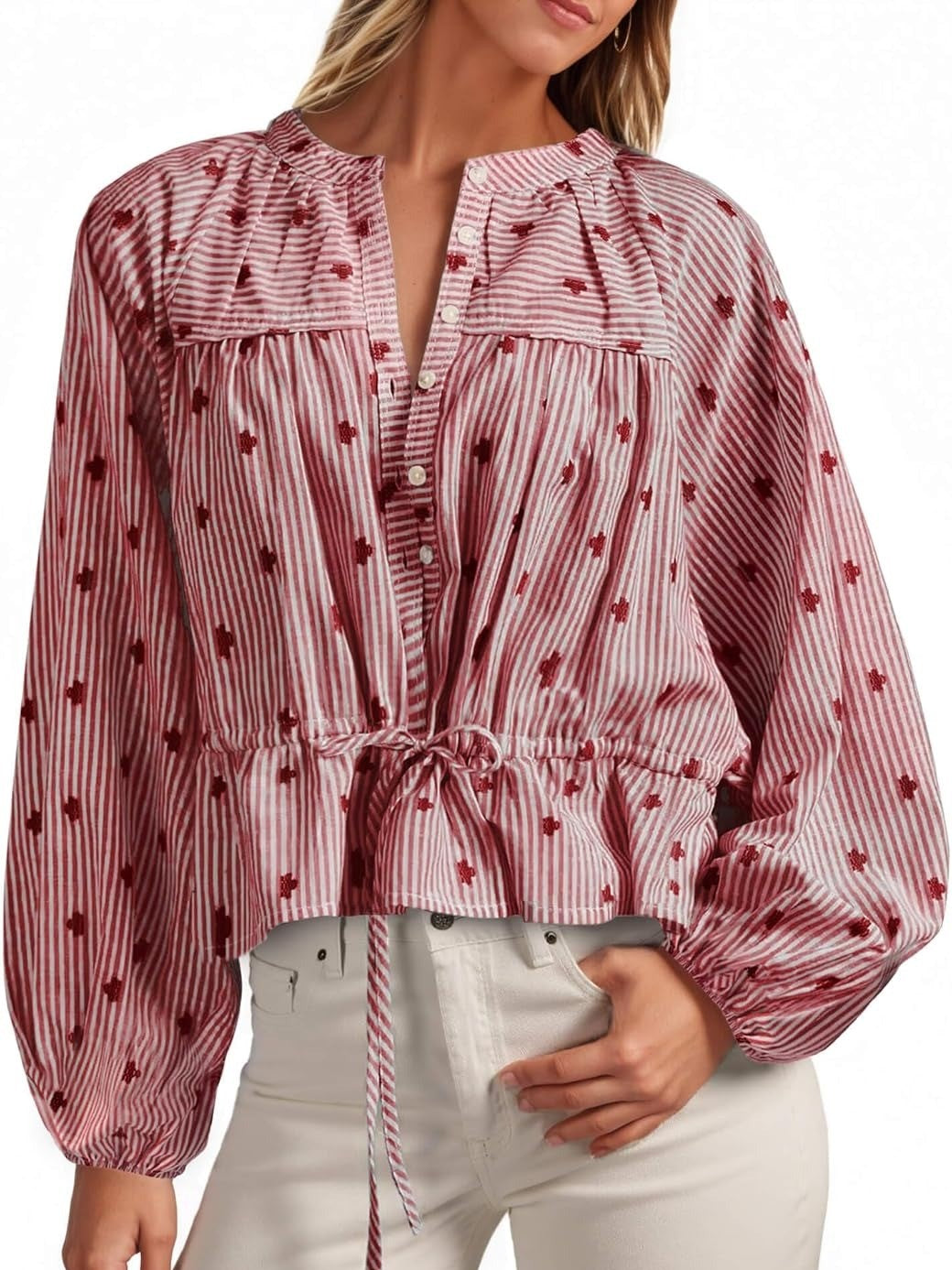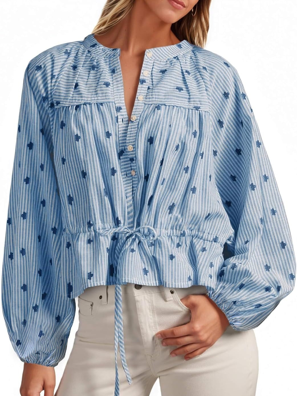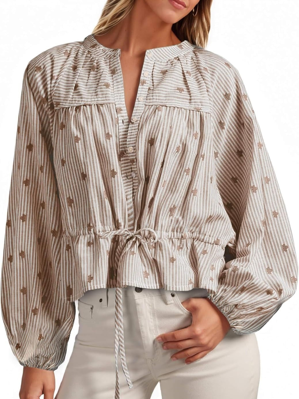 Effortlessly refined, this women’s striped top features elegant balloon sleeves and a tie-waist detail to flatter various silhouettes. Subtle patterns and stripes add refreshing charm, while a range of gentle colors offers versatile styling for every occasion.