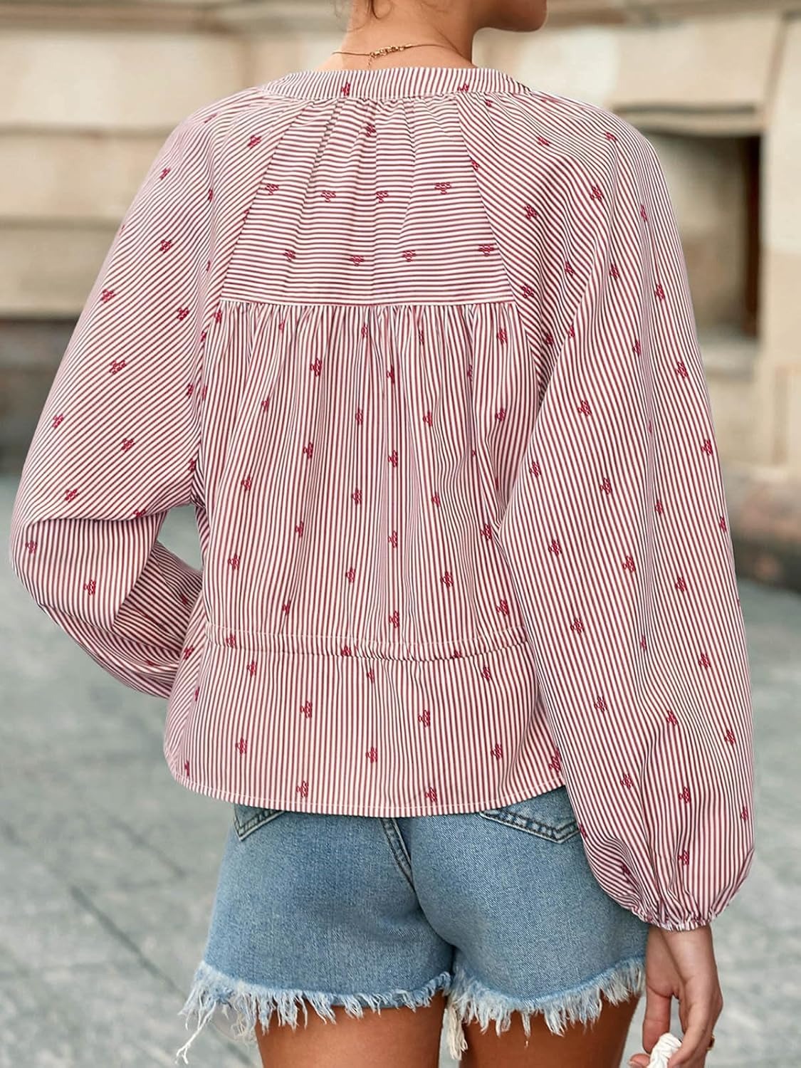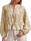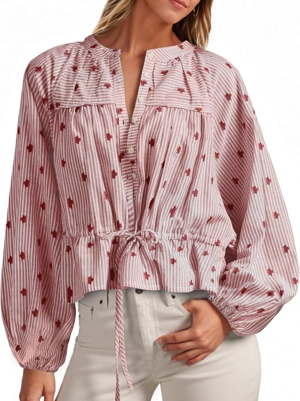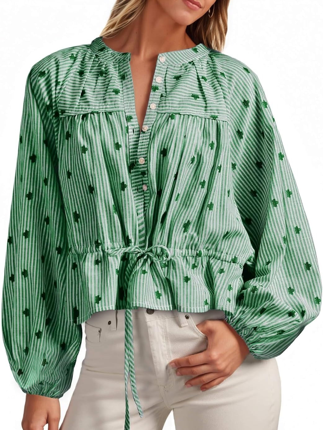 Effortlessly refined, this women’s striped top features elegant balloon sleeves and a tie-waist detail to flatter various silhouettes. Subtle patterns and stripes add refreshing charm, while a range of gentle colors offers versatile styling for every occasion.