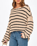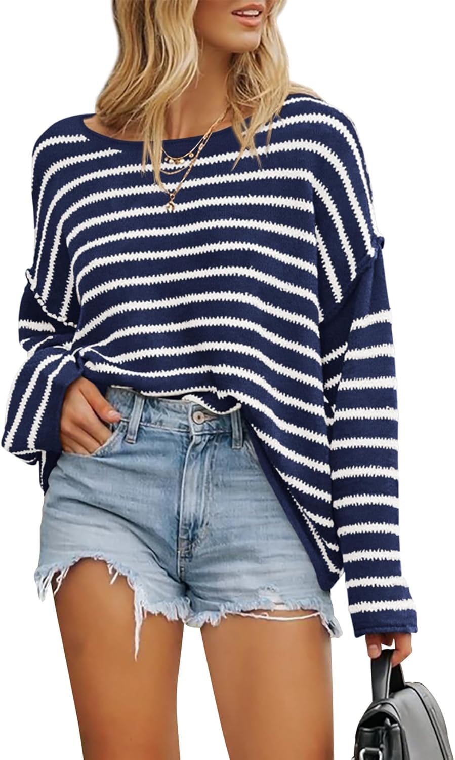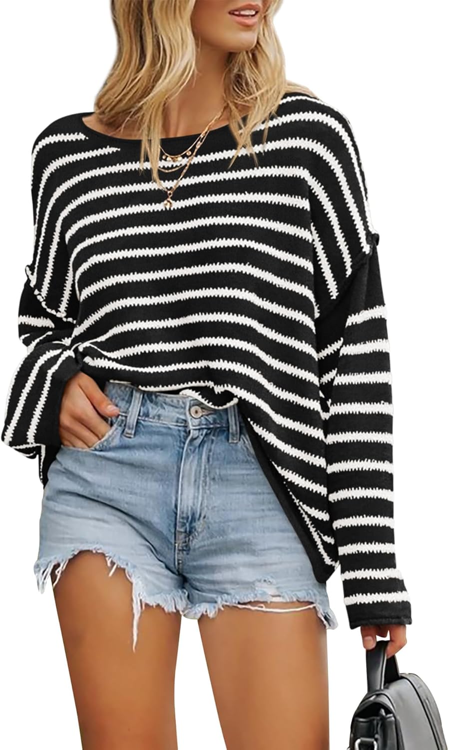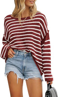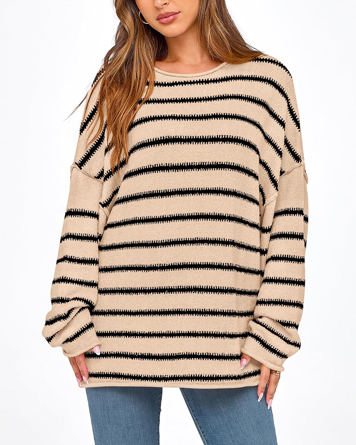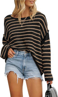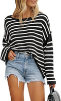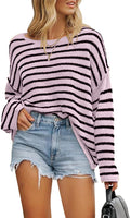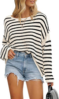 The Striped Pullover Sweater Takes An Eye-Catching, Classic Striped Pattern. It Has Loose Silhouette, Stylish Drop Shoulder And Striking Stripes. Combine With Skinny Jeans Or Leggings And Boots, Creating An Chic Fall/Winter Look.