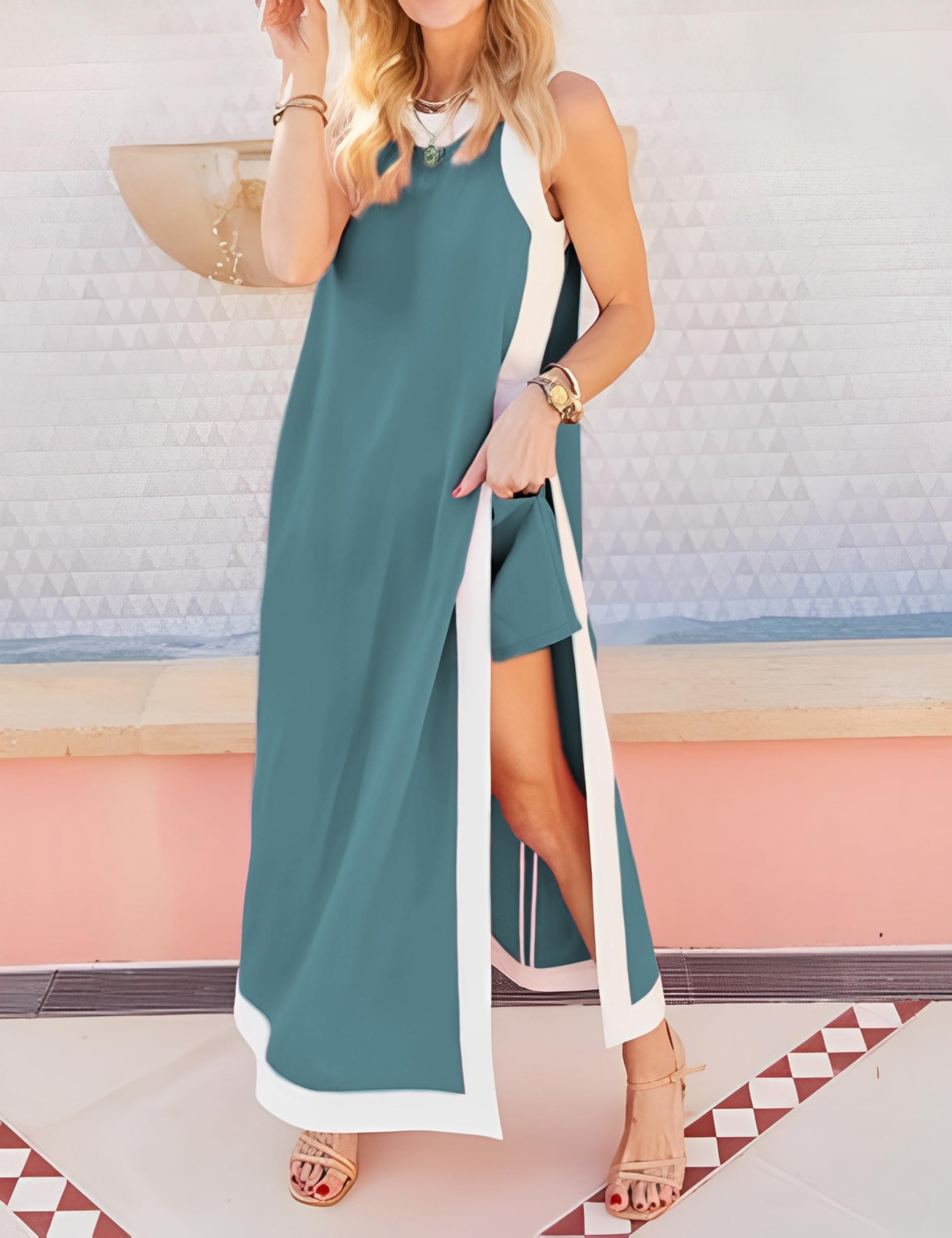 Women's Bohemian Colorblock Sleeveless Maxi Dress Shorts Two-Piece Set