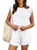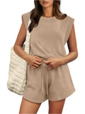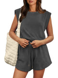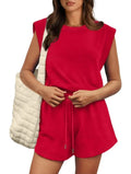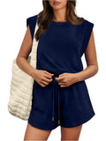 Women's Cap Sleeve Adjustable Drawstring Waistband Rompers with Pockets