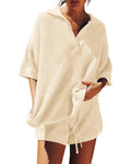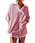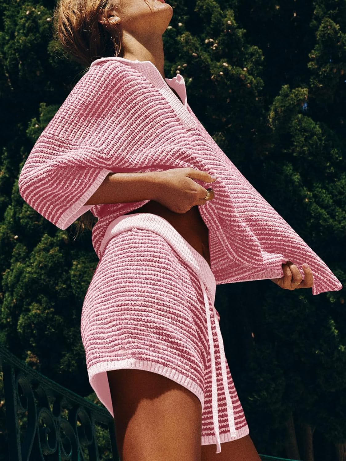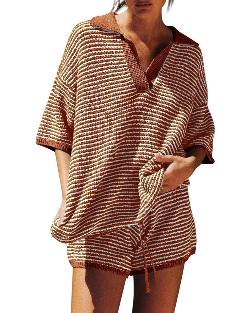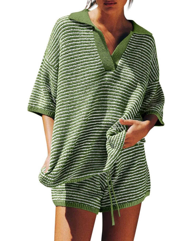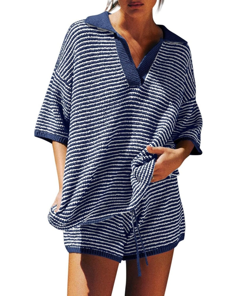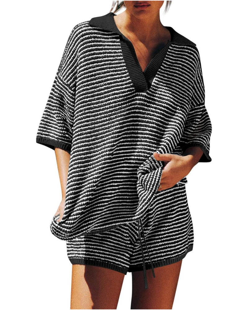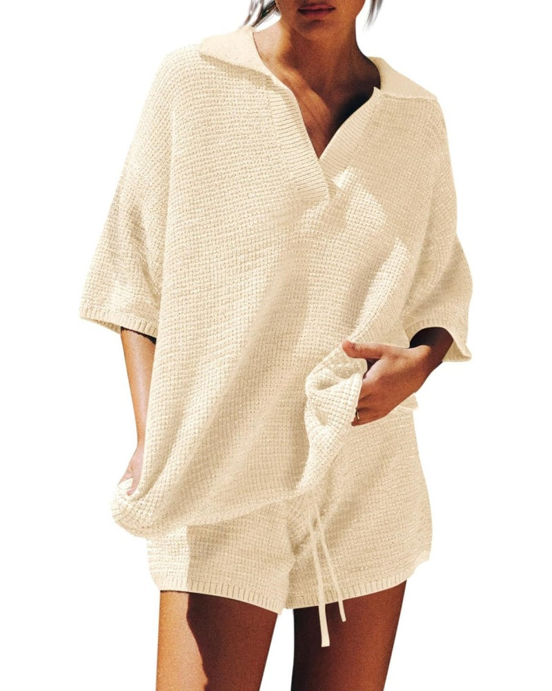 Elevate your wardrobe with this casual 3/4-sleeve V-neck knit top and High-Waist Shorts Set. Featuring a comfortable fit and modern style, it's perfect for versatile, everyday wear.