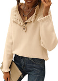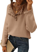 This stylish solid-color sweater impresses with its ruffle detailing and top button fastening. Wear it unbuttoned or buttoned to reveal a flattering V-neck or retro crew neckline. The long sleeves with knitted ruffle cuffs are particularly flattering. This sweater is a timeless and ideal companion for cold weather.