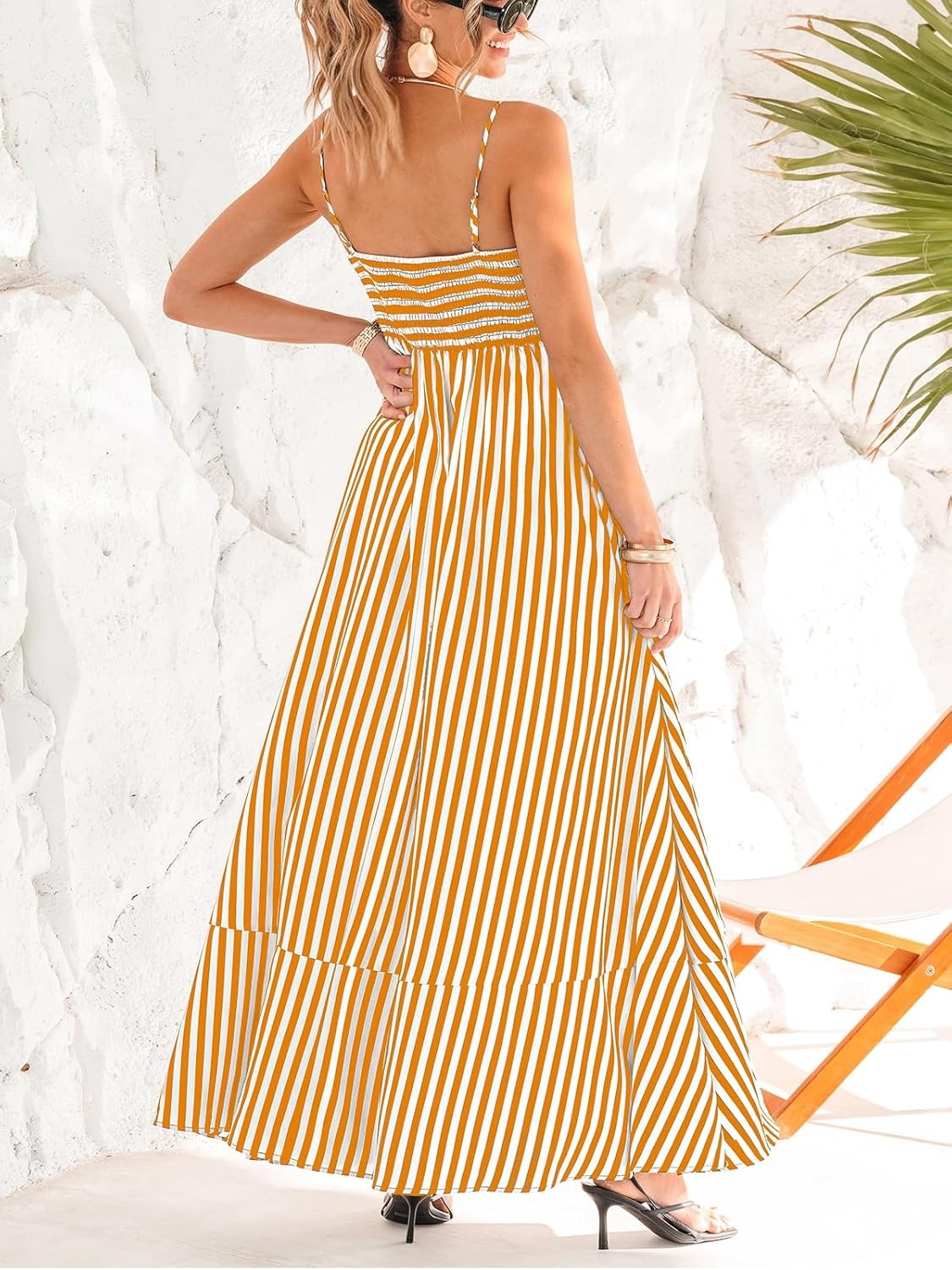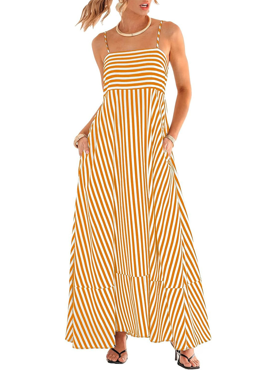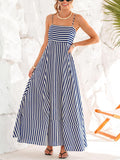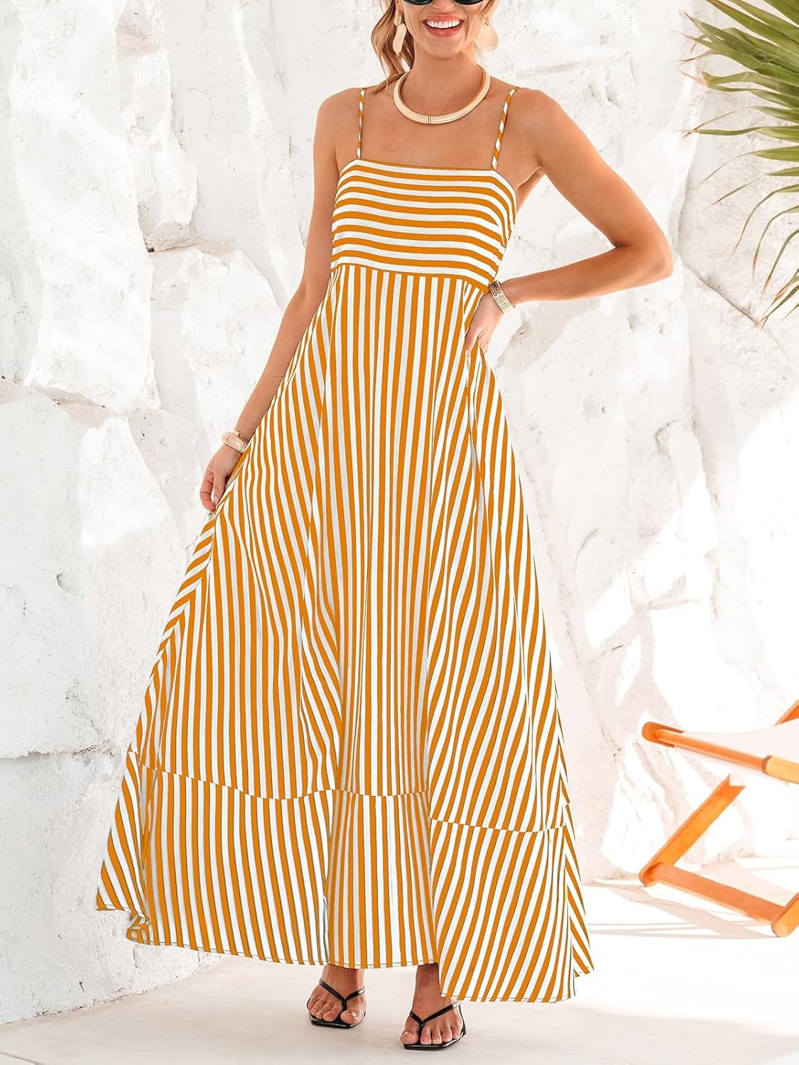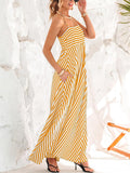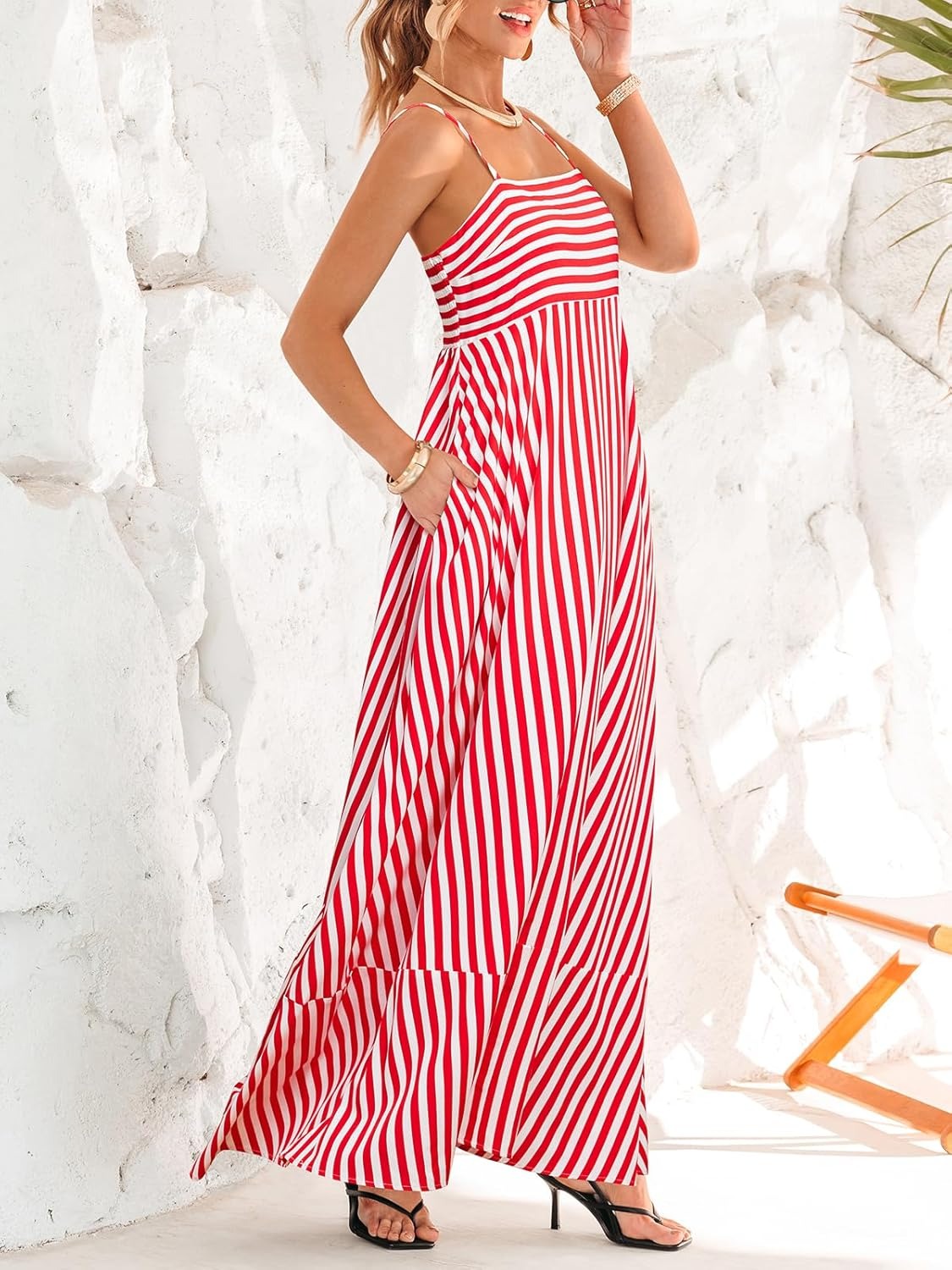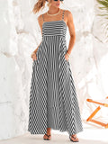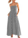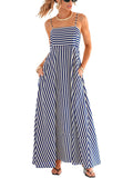 Women's Casual Spaghetti Strap Striped Beach Maxi Dress with Pockets