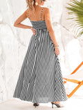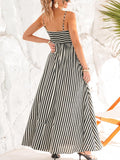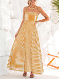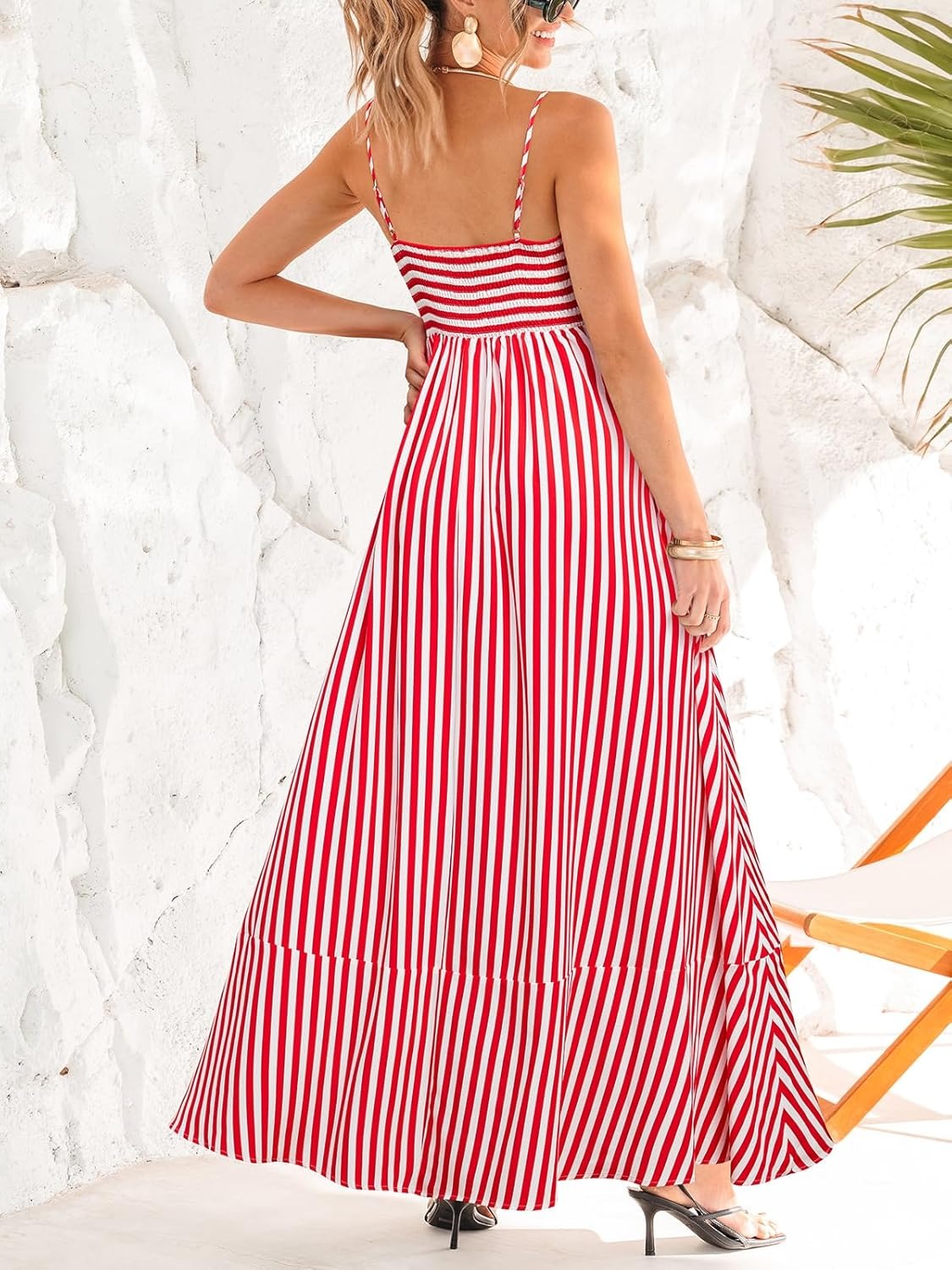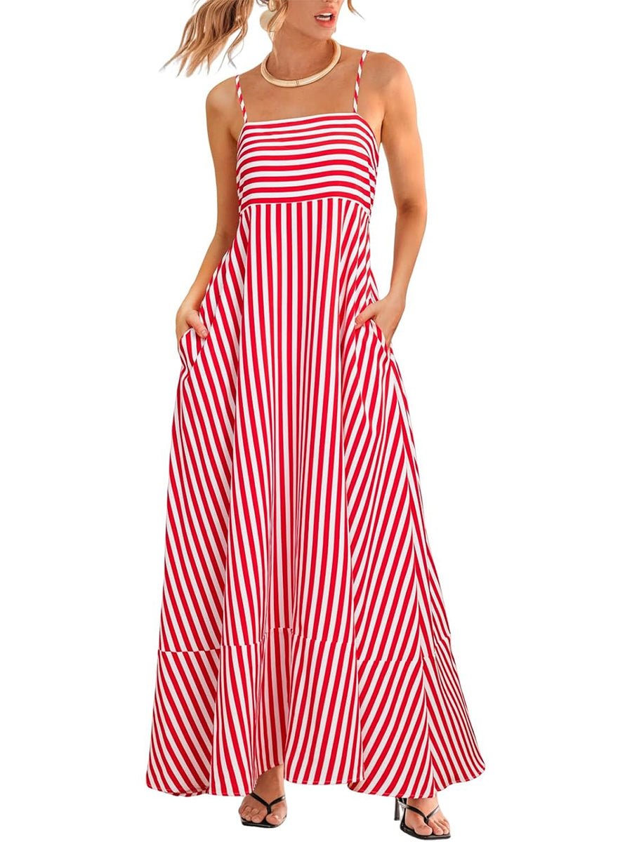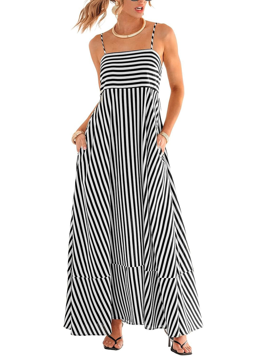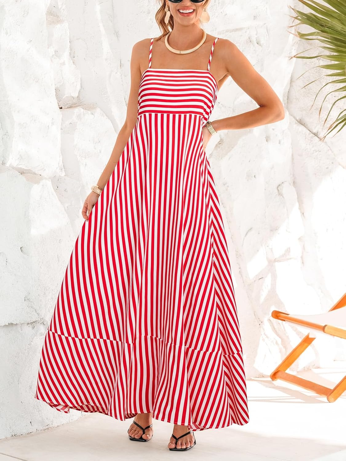 Women's Casual Spaghetti Strap Striped Beach Maxi Dress with Pockets