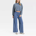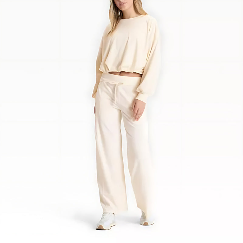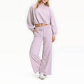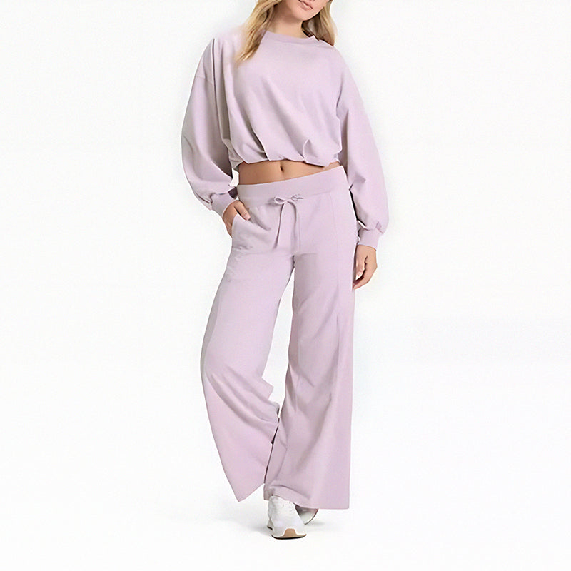 Our long-sleeved wide-leg two-piece set offers all-day comfort. Featuring a simple solid color, an adjustable drawstring, and side pockets for easy storage, it can be worn as a set or mixed with other pieces in your wardrobe for an effortless and casual look.