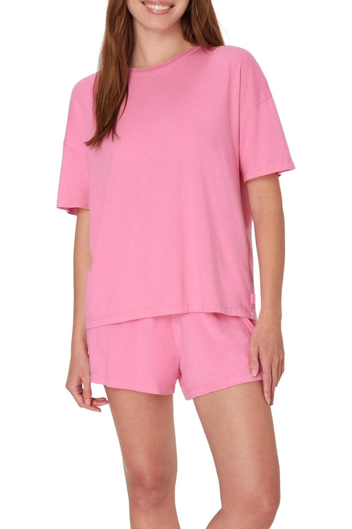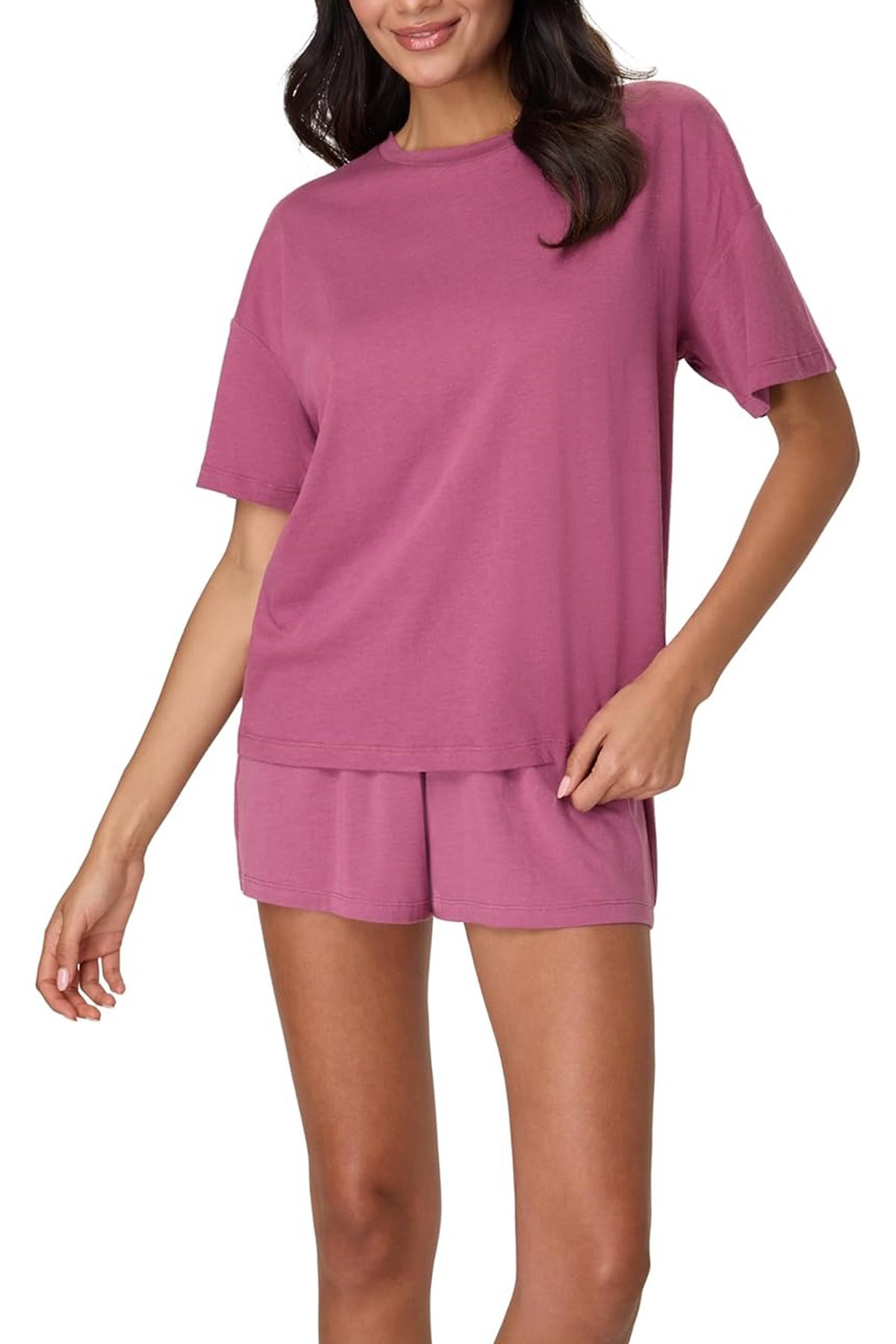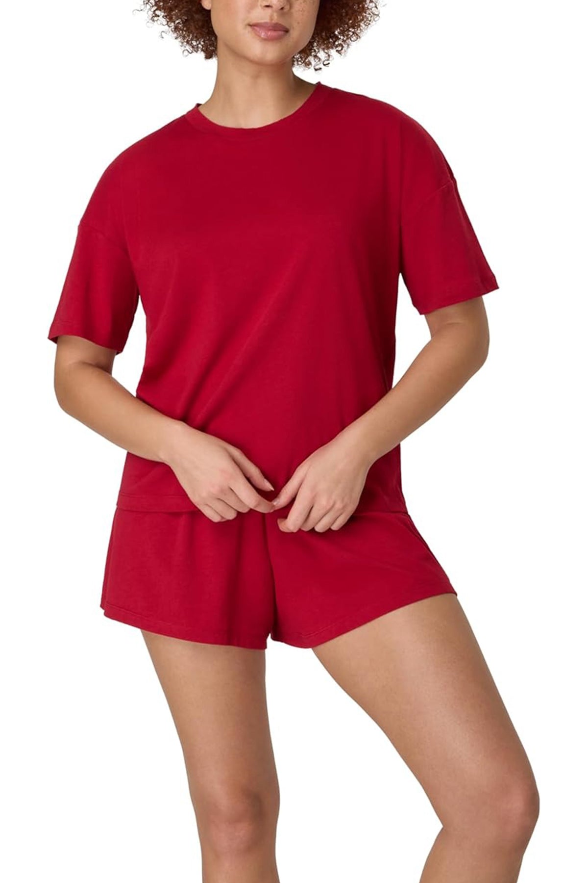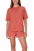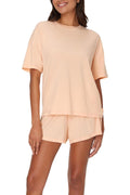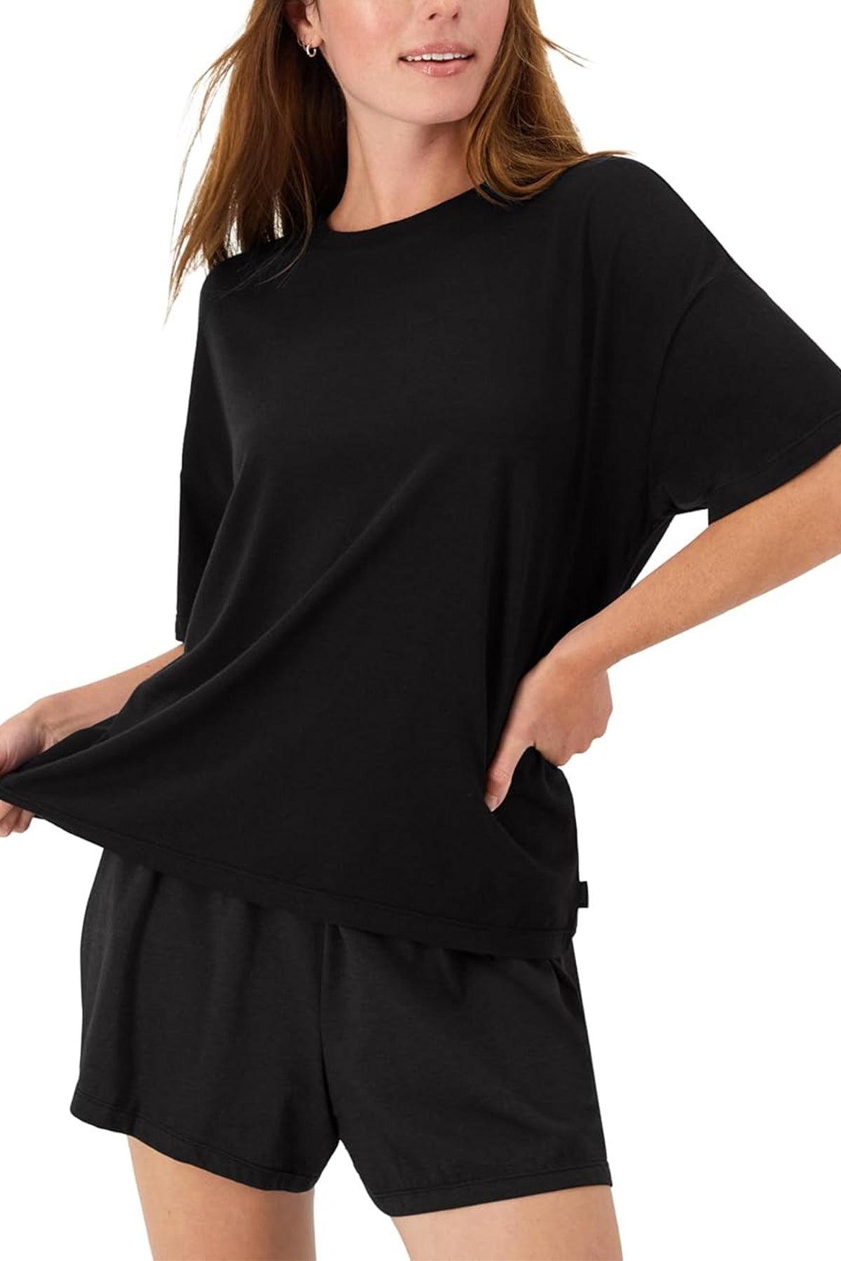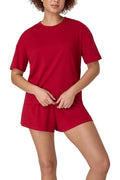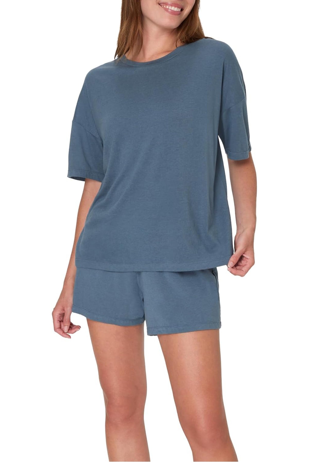 Our softest fabric ever, combining cotton and spandex, allows for effortless movement. The boxy tee features a classic crew neck design, while the sleep shorts offer a luxurious, tonal, soft elastic waistband for a comfortable, airy feel.