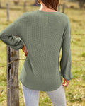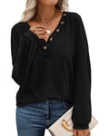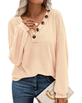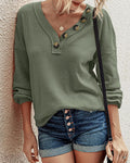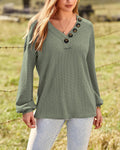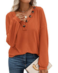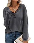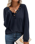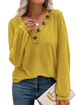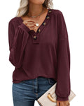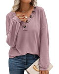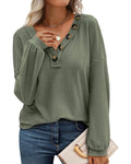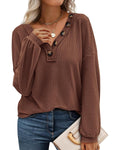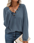 Women's Casual V Neck Deco Button Lightweight Waffle Knit Tops