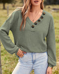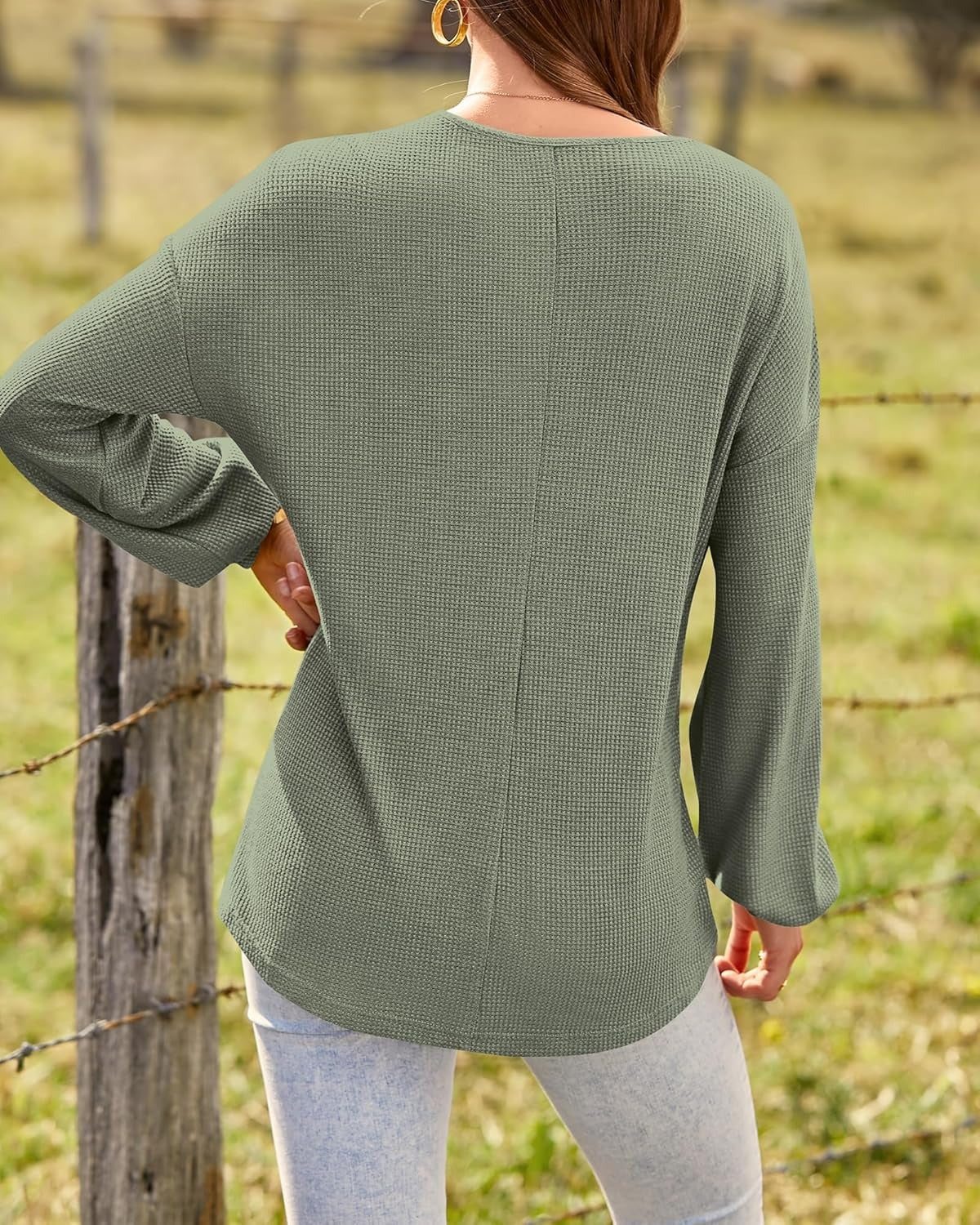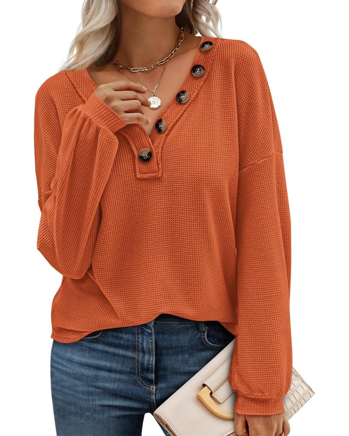 Definitely a new favorite! Get cozy with our waffle knit top! Finished with deco buttons, the charming V neck can flatter your neck curve elegantly. And the lantern long sleeves makes this loose fit womens tops distinctive. Perfect combine with various garments to make all kinds of styles.