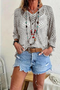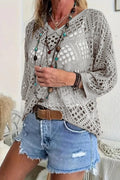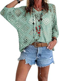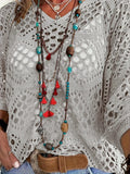 Women's Casual V-Neck Hollow Crochet Cover-Up Short Sleeve Top