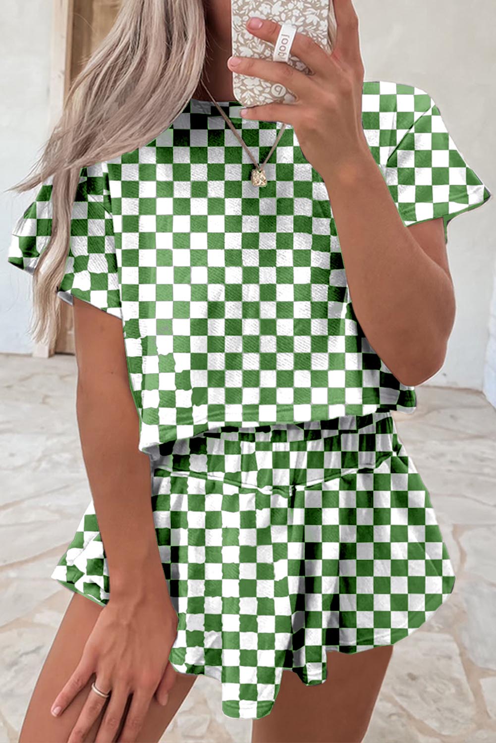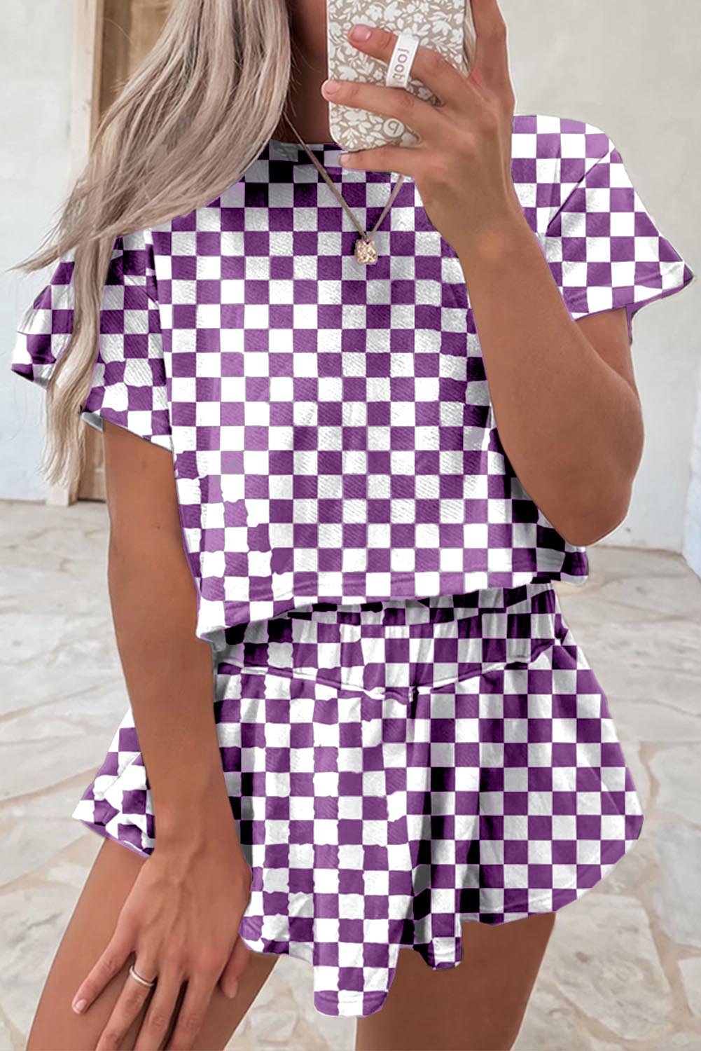 This Women's Checkerboard T-Shirt and High Waist Skorts 2-Piece Set offers a stylish and comfortable look. Crafted for a flattering fit, it combines trendy design with everyday versatility, perfect for casual outings or active wear.