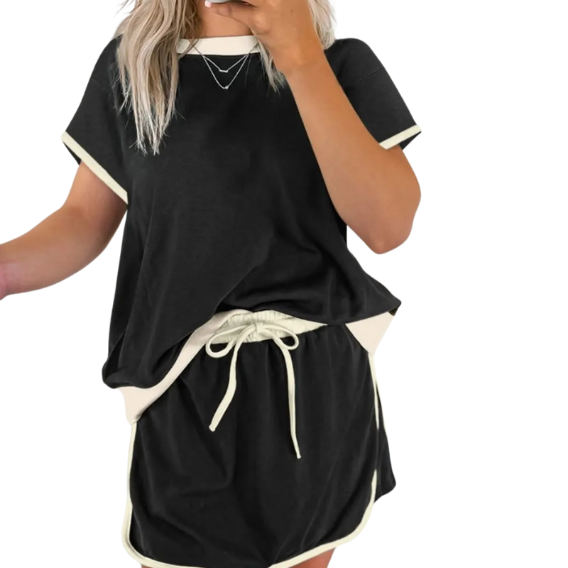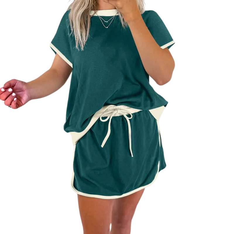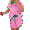 Indulge in the perfect blend of style and comfort with our Colorblock Edge Drop Shoulder T Shirt Skort 2Pcs Set. This versatile outfit features a stylish design with a round neck and a drawstring waist skort, offering a comfortable and flattering fit. Crafted in a vibrant summer color and made from soft, stretchy fabric, this set is ideal for any occasion – whether you're on vacation or simply lounging around. Elevate your summer wardrobe with this must-have ensemble!