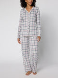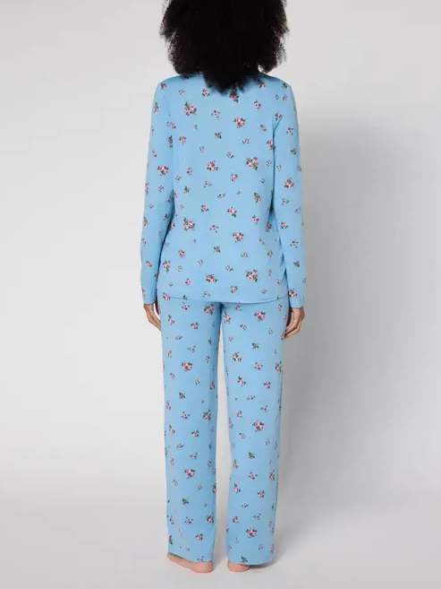 Designed for all-day comfort, this two-piece pajama set features a long-sleeved, V-neck, ruffled top in a refreshing print. The matching pants feature a flowy silhouette and a relaxed fit for easy movement.