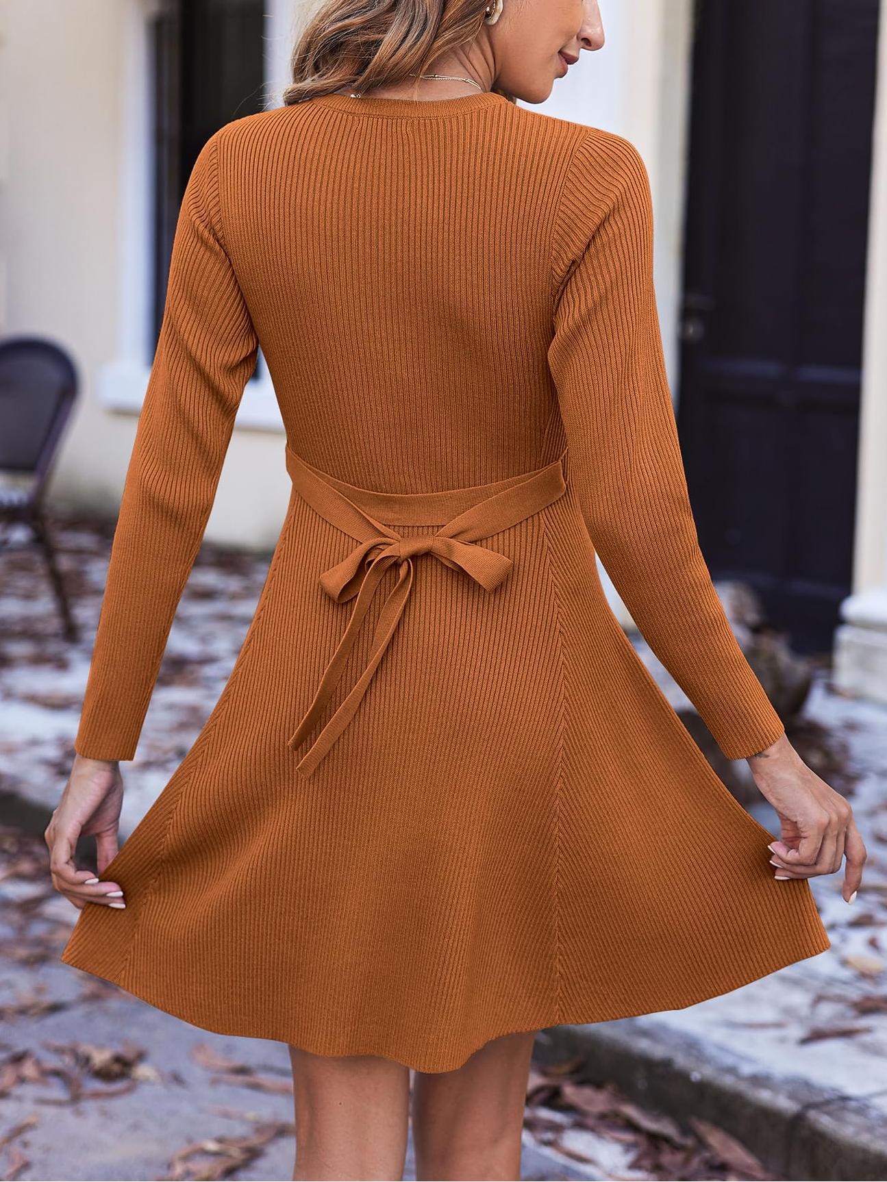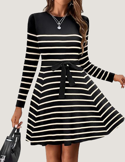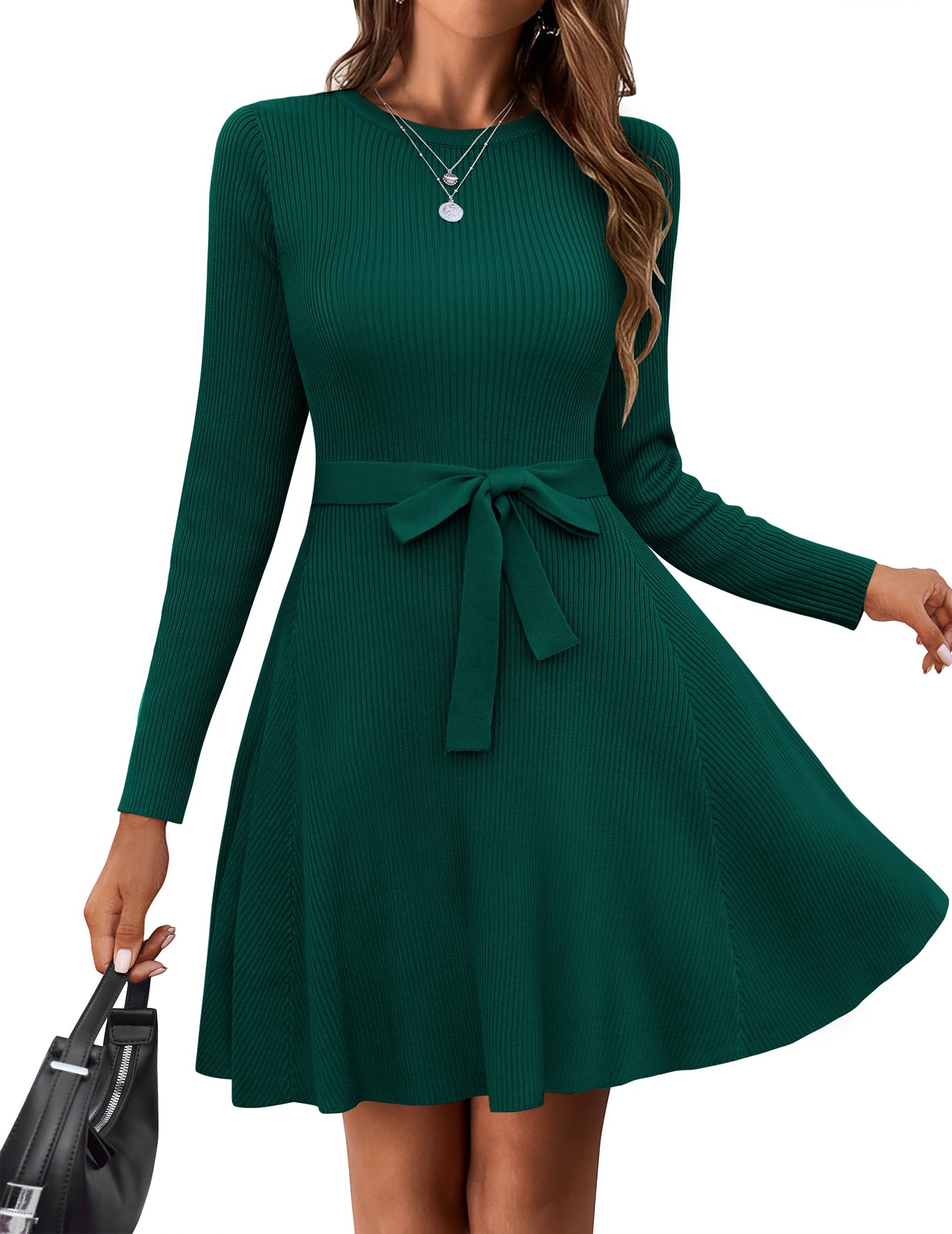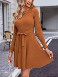 Wrap yourself in timeless style with this cozy A-line sweater dress. Featuring a flattering crewneck and long sleeves, this dress beautifully defines your waist with a delicate tie belt, creating a graceful silhouette. Perfect for casual outings or dressier occasions, its soft knit fabric ensures you stay comfortable and stylish all day long.