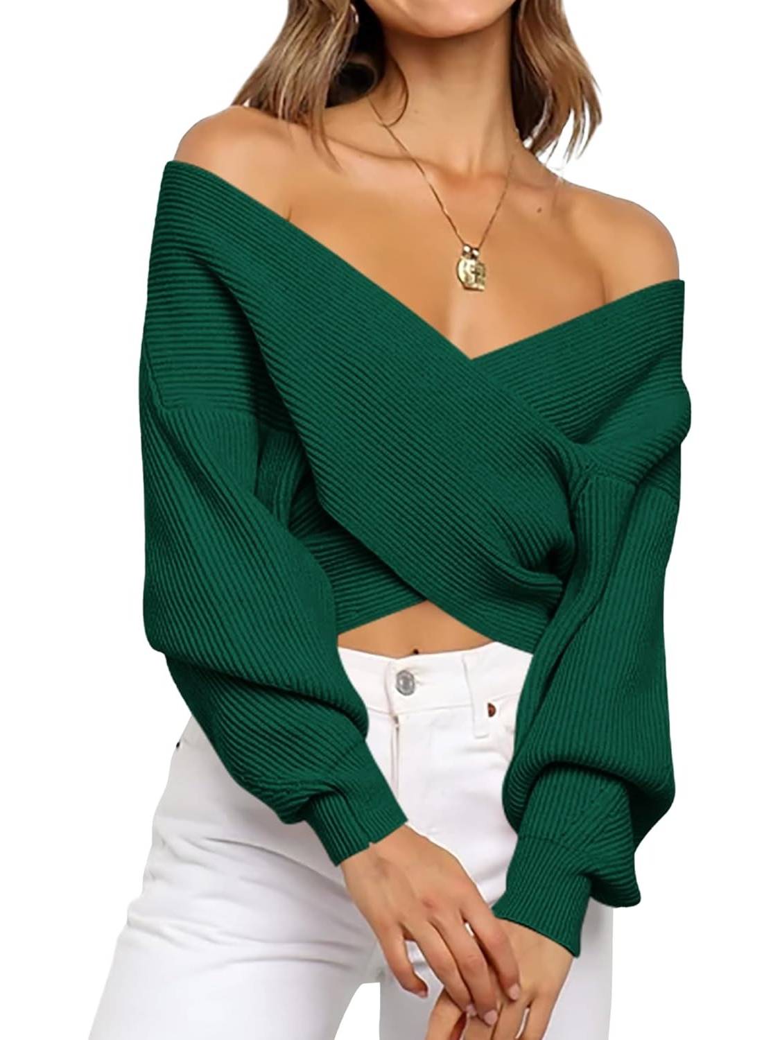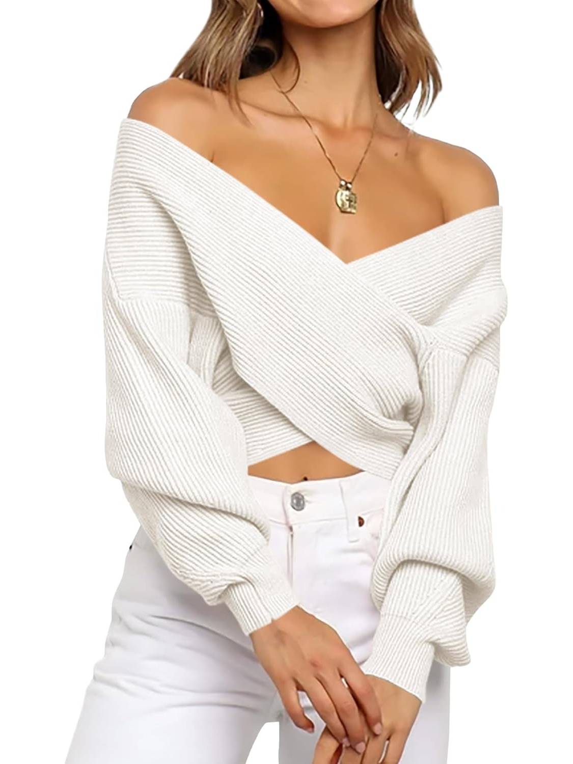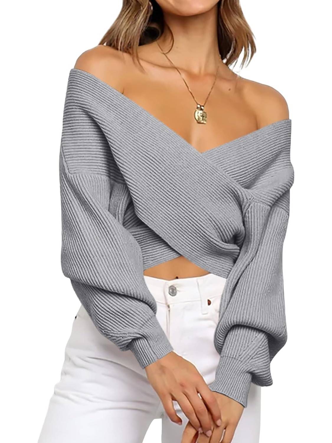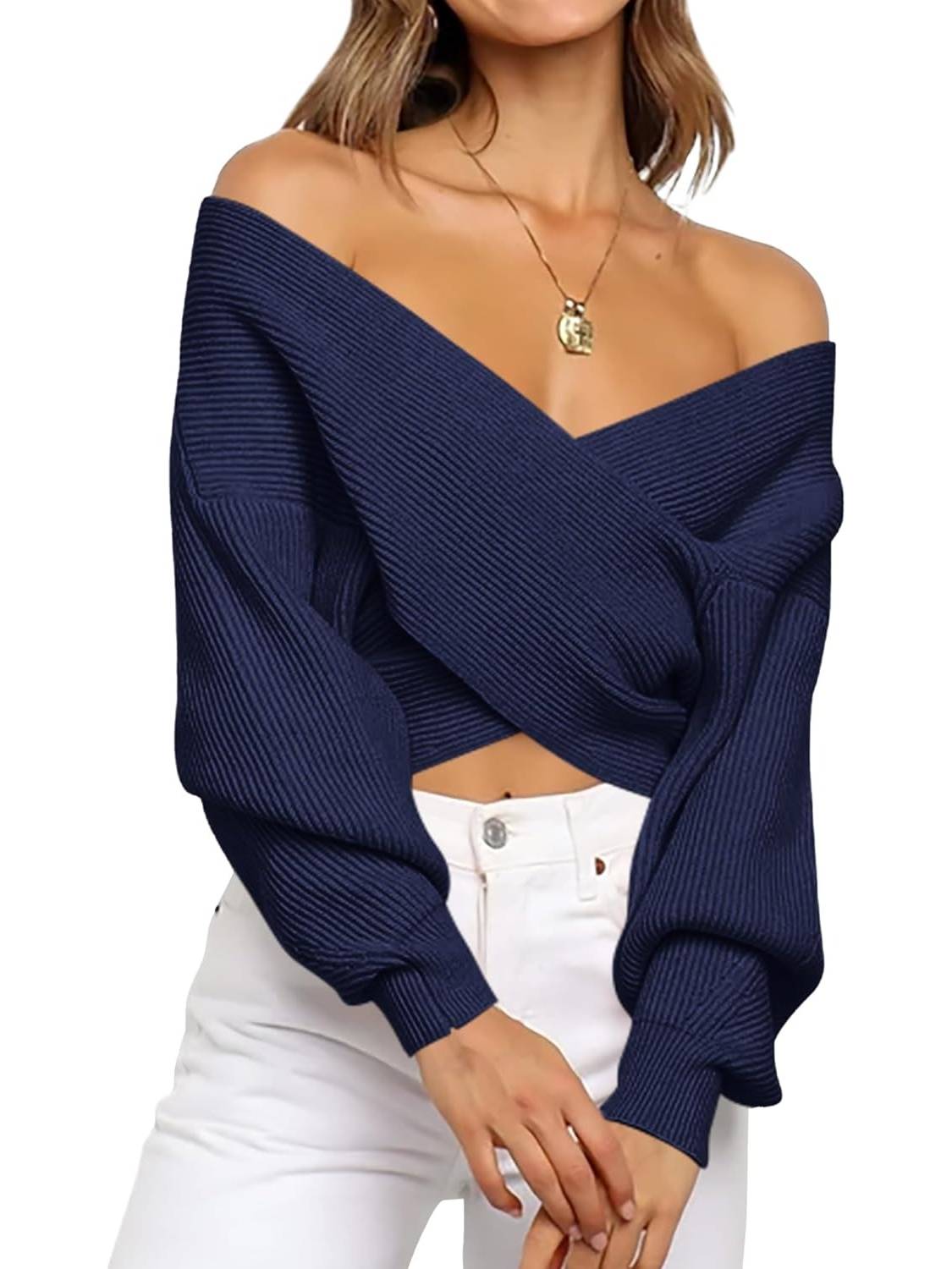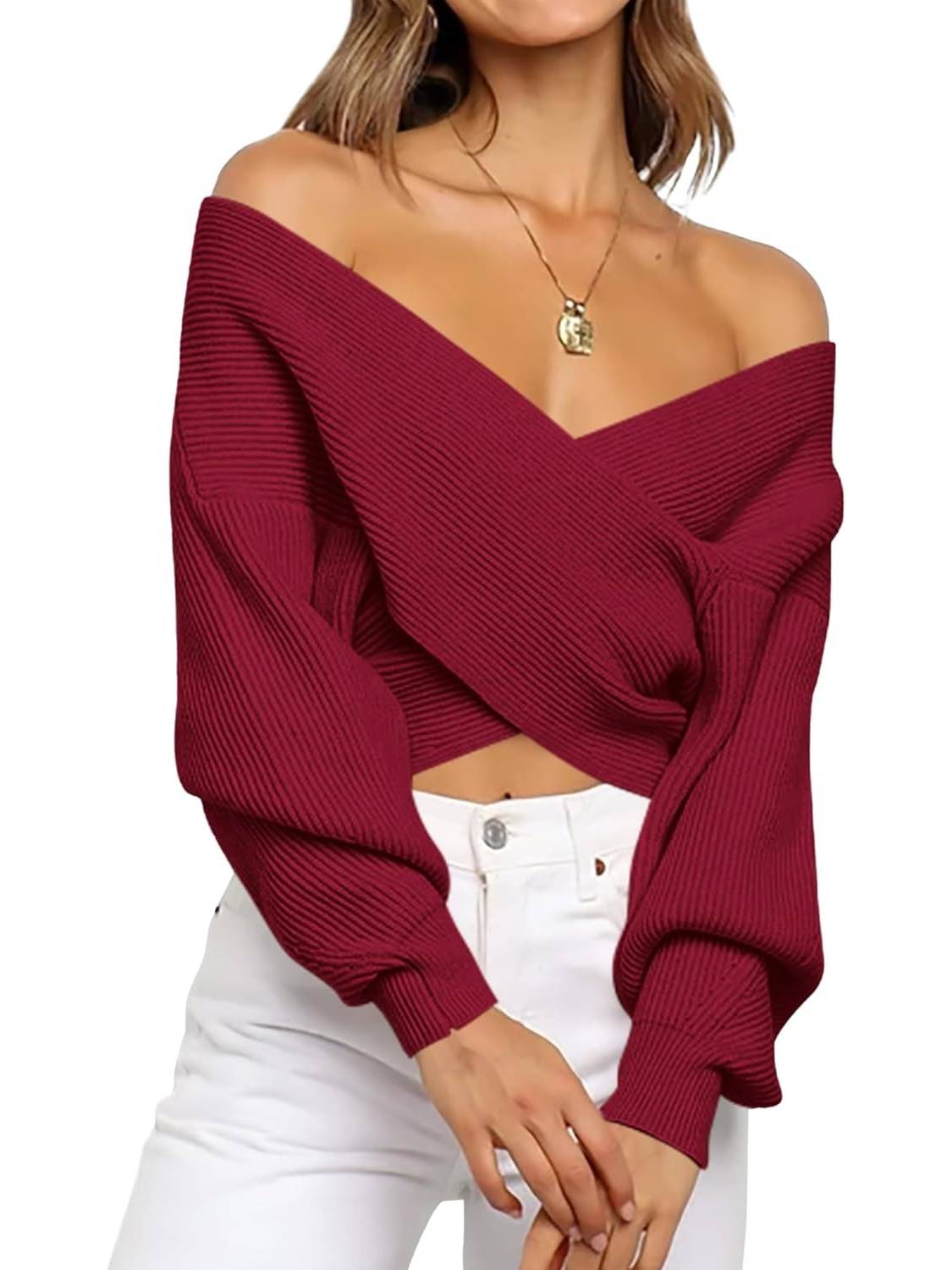 This women's sweater is made from soft, next-to-skin fabric for comfort. The timeless solid color and long, balloon-shaped sleeves add a touch of flair, giving this wrap a relaxed, casual look. The flexible, crossover wrap V-neck design adds a touch of sophistication to this off-the-shoulder sweater for women!