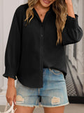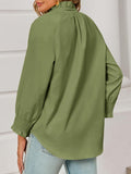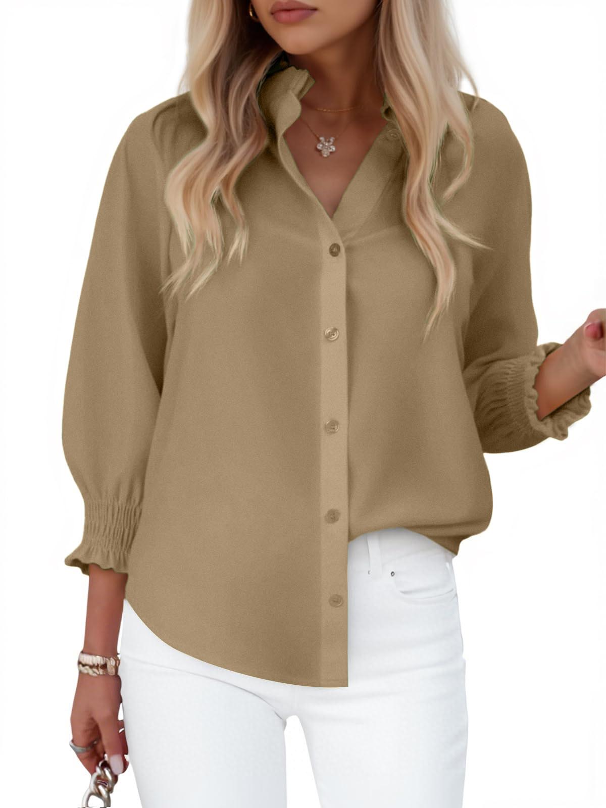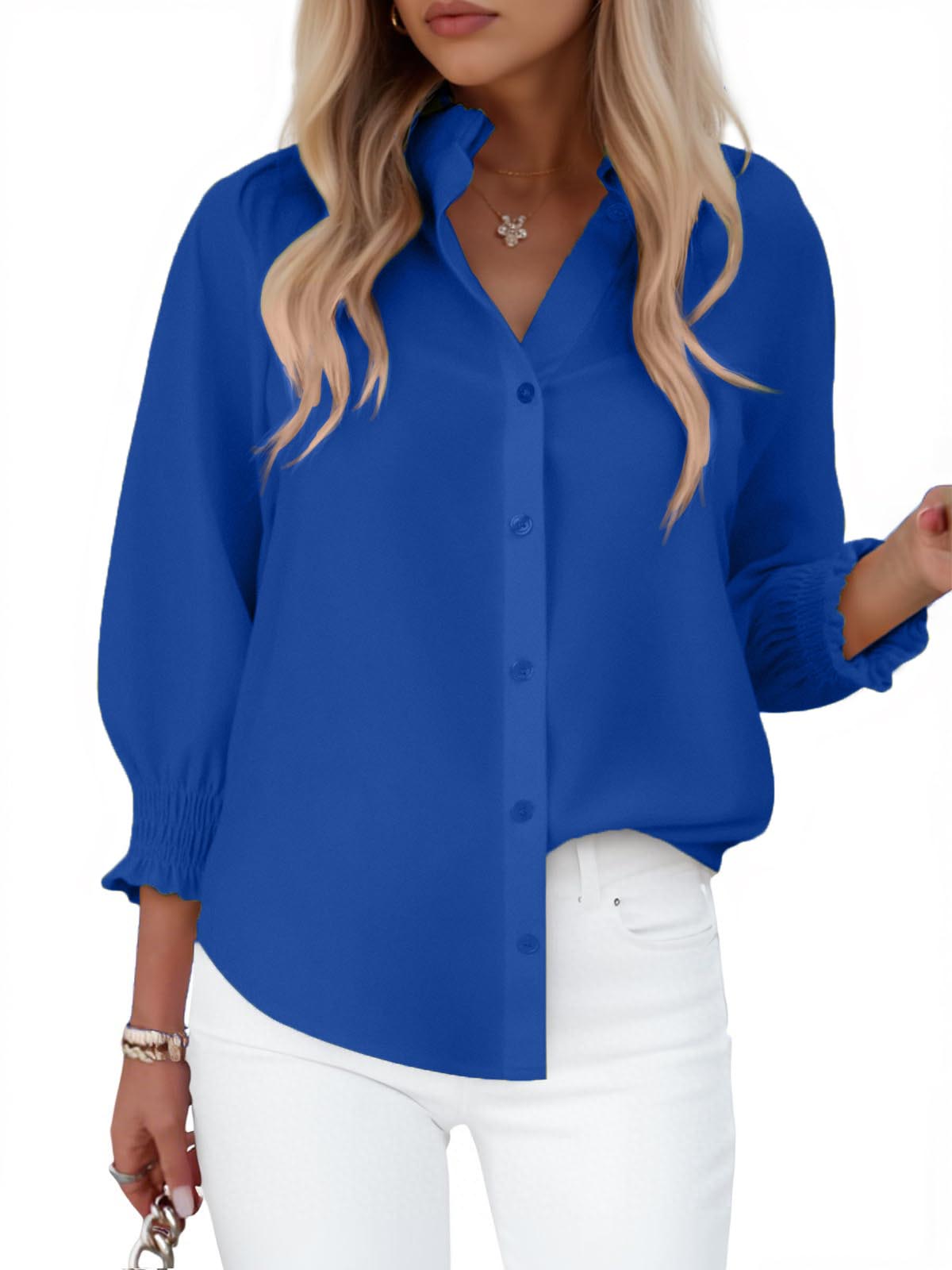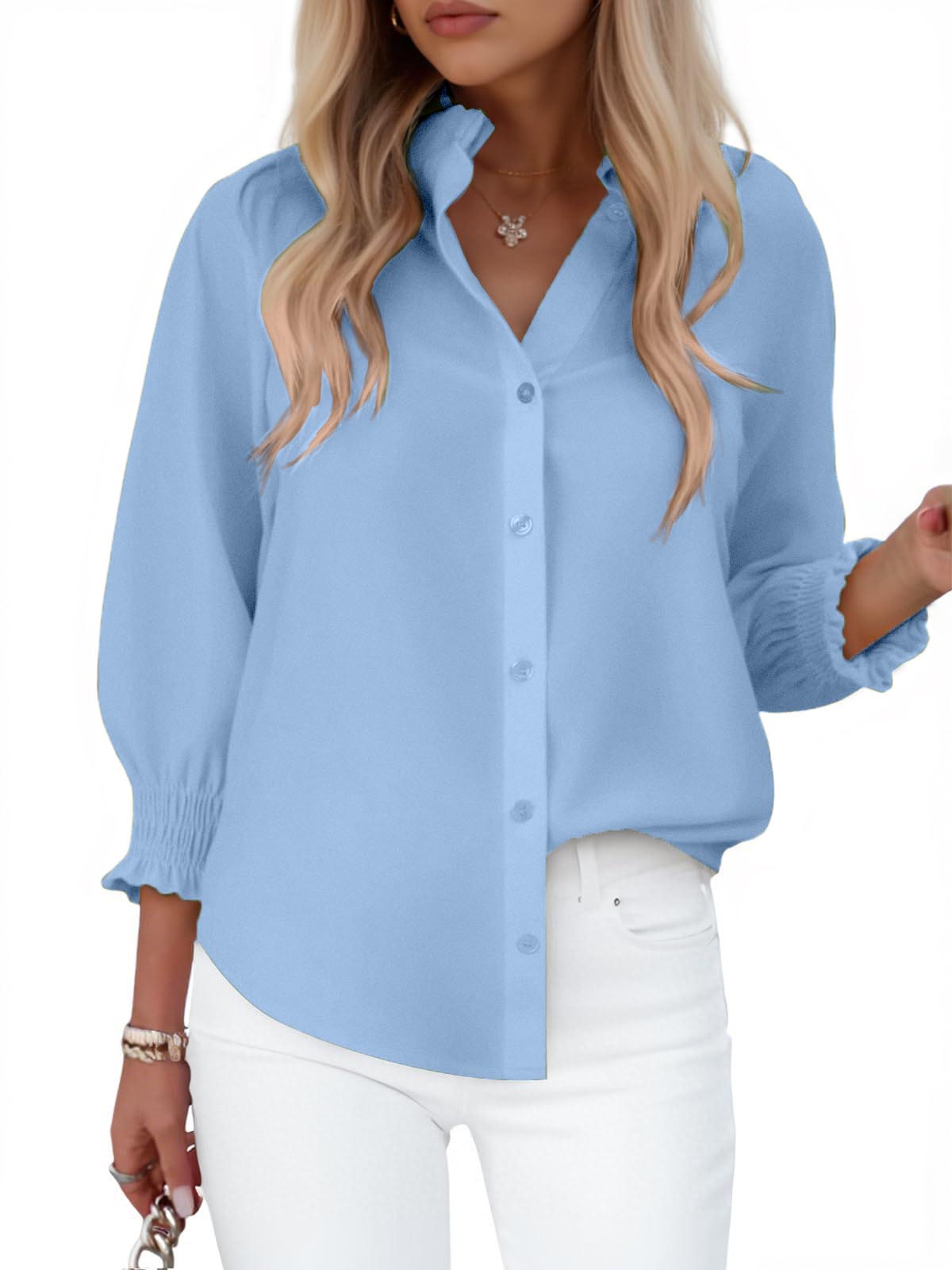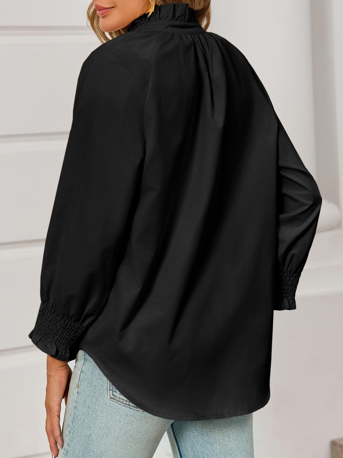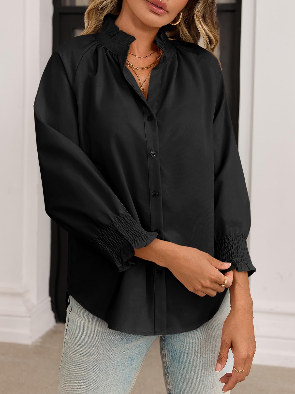 Elegant ruffle neckline with button-down front closure and smocked sleeve for effortless style!The long puffed sleeves give you a playful, cute look while providing ample room for comfortable arm movement. This elegant casual blouses has excellent drape, perfectly complementing your figure!