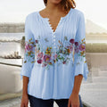 Women's Floral Button V-Neck Pleated 3/4 Sleeve T-Shirt