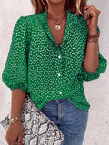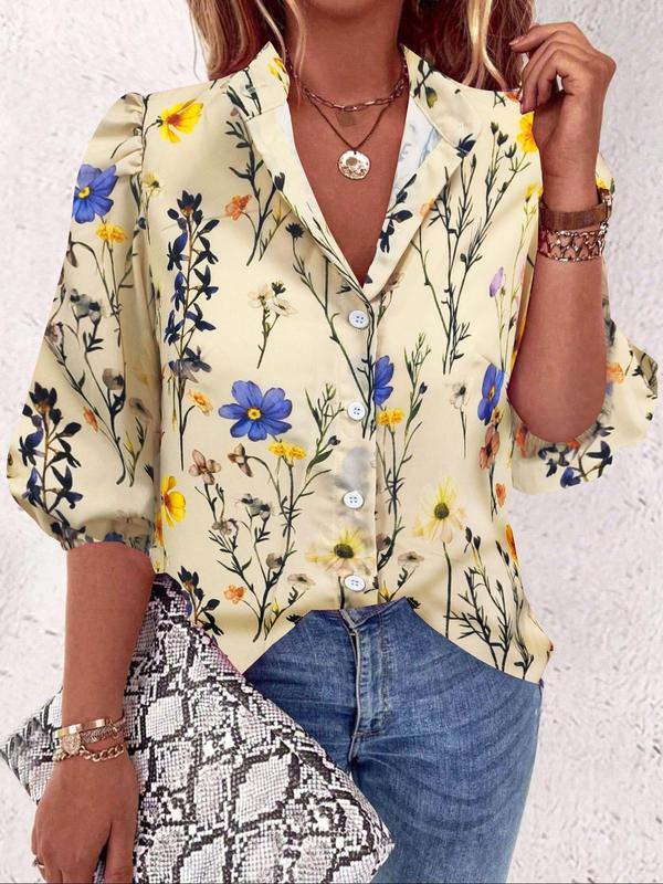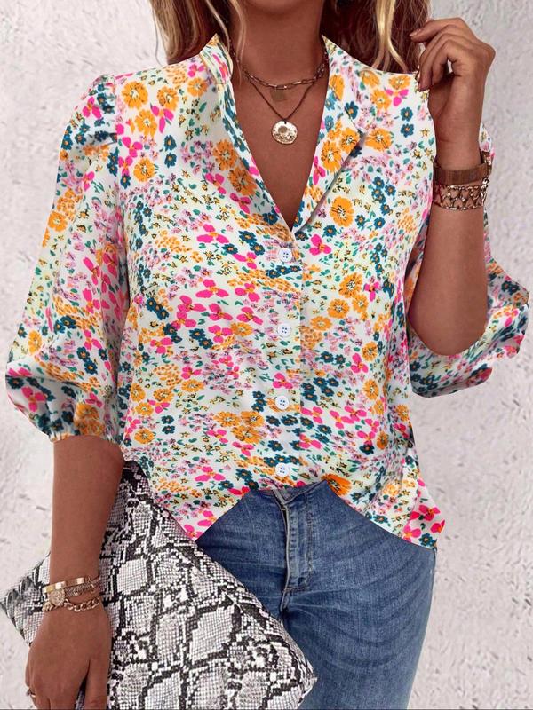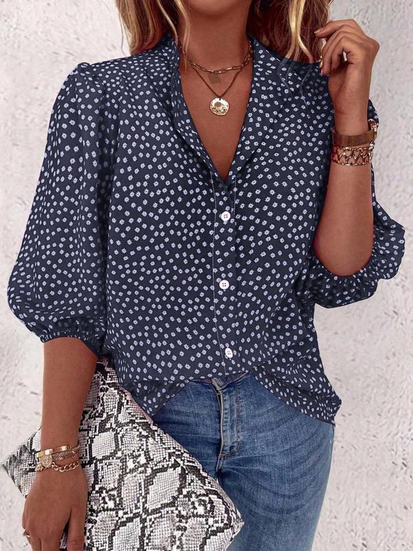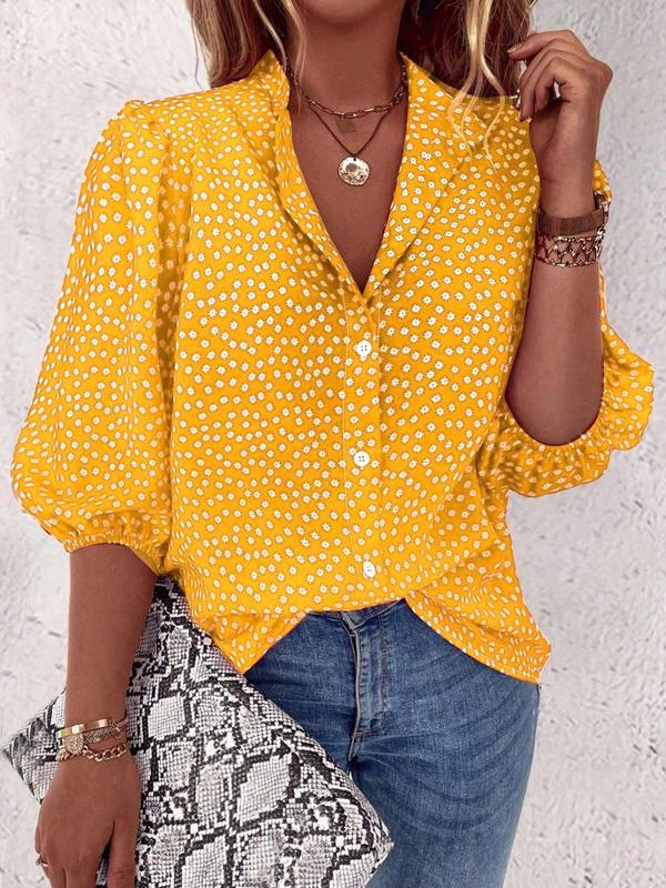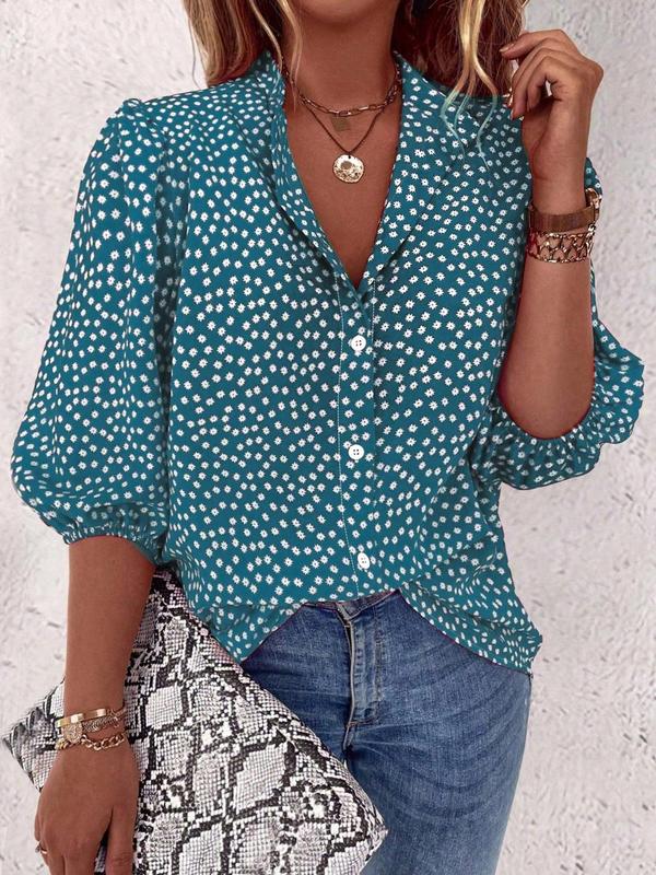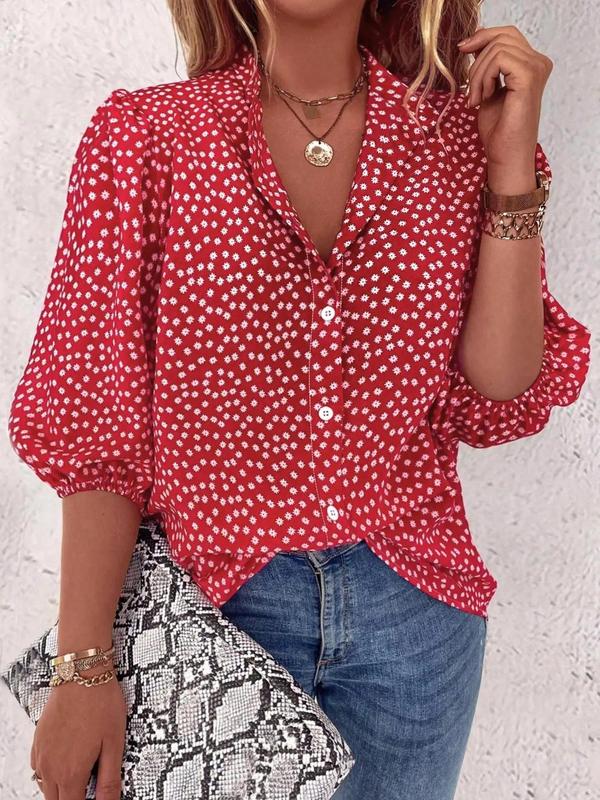Women's Floral Puff Sleeve Print Shirt Dots Thru Shirt Blouse